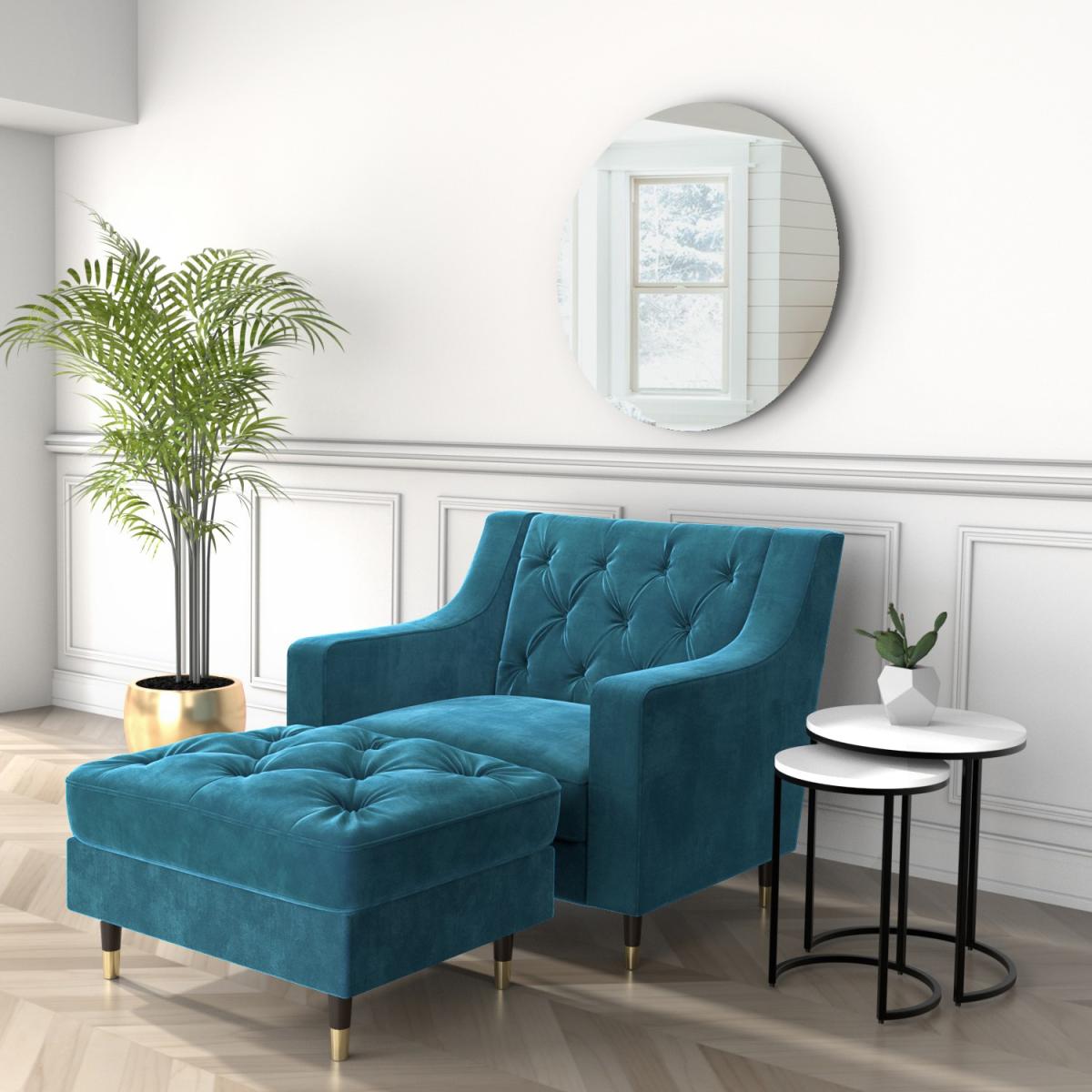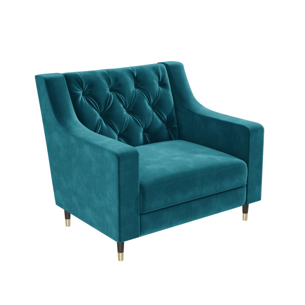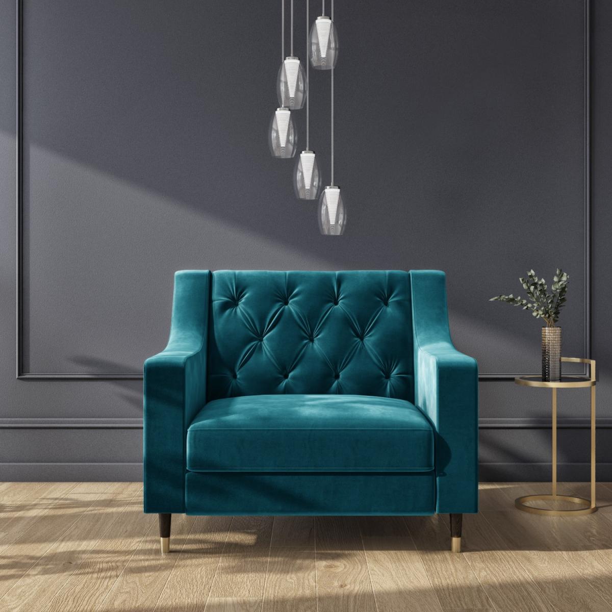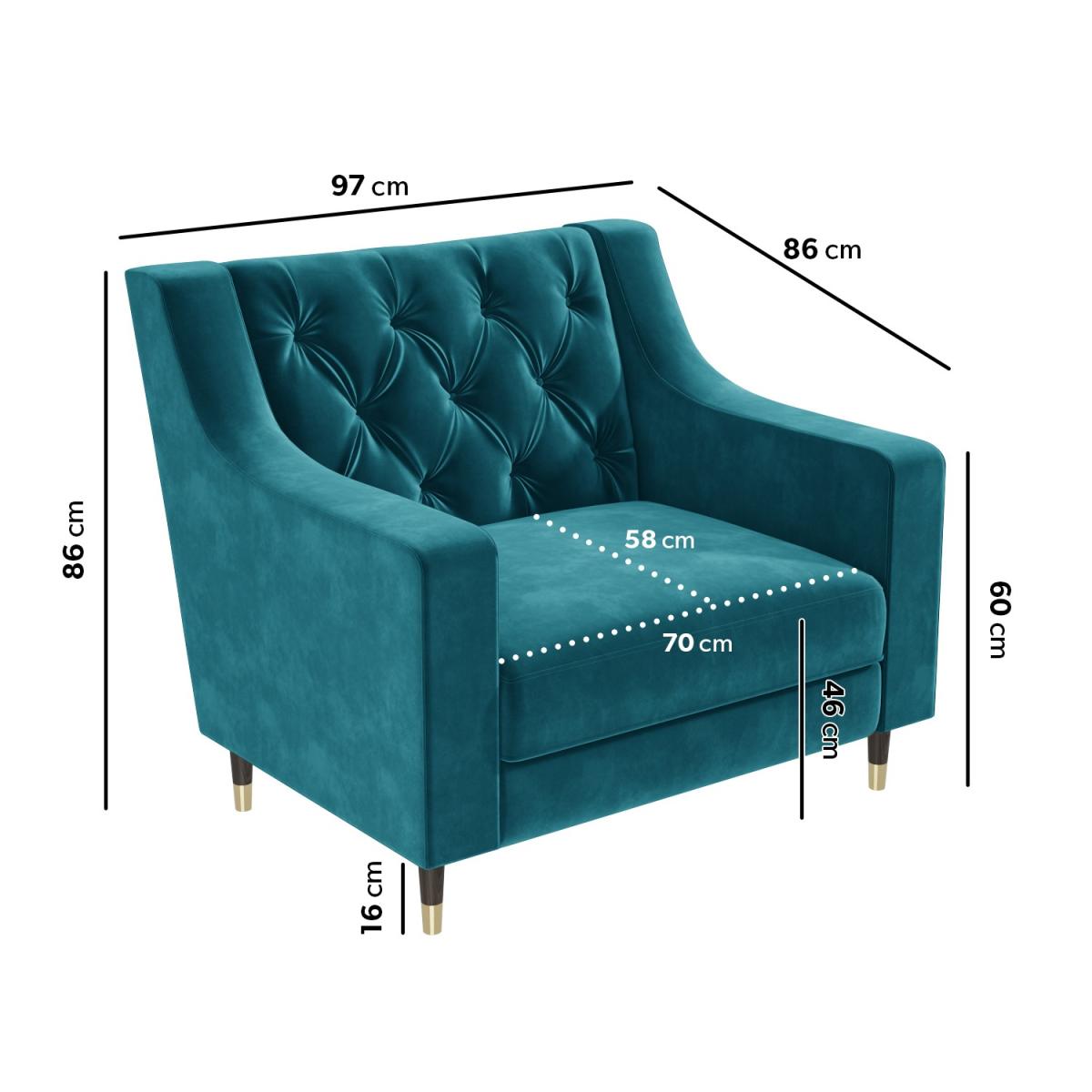 Features we love Stylish armchair with deep button back detailing. Upholstered in a luxurious soft blue velvet. Finished with sophisticated wooden legs with gold tips. Cushions are filled a comfortable high-quality foam Minimal assembly required simply attach the legs. Matching sofa and footstool available. Need to know. Dimensions. H86 x W97 x D86cm Seats. 1 Weight. 27kg Colour. Petrol blue Finish. Velvet upholstery Material. Velvet fabric with eucalyptus and plywood frame Maximum supported weight. 110kg Filling. Foam-filled Assembly required. Yes..