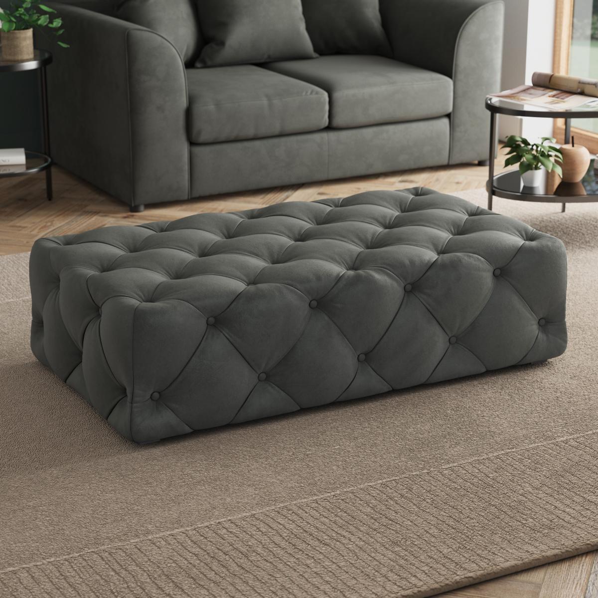 I love this big velvet footstool for its versatile and sophisticated look - the buttoned detail adds a timeless touch that works well in both classic and contemporary interiors. It’s a practical piece that can serve as extra seating, a cosy footrest, or even a statement centrepiece. The grey hue is neutral enough to pair with various colour schemes, from soft pastels to bold accents. Style it in a lounge or a reading nook with layered textures like plush throws or patterned rugs for added visual interest. It’s especially effective in making a space feel more inviting and comfortable, while still keeping a chic, polished aesthetic.