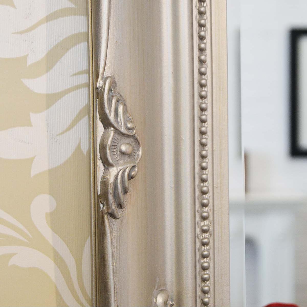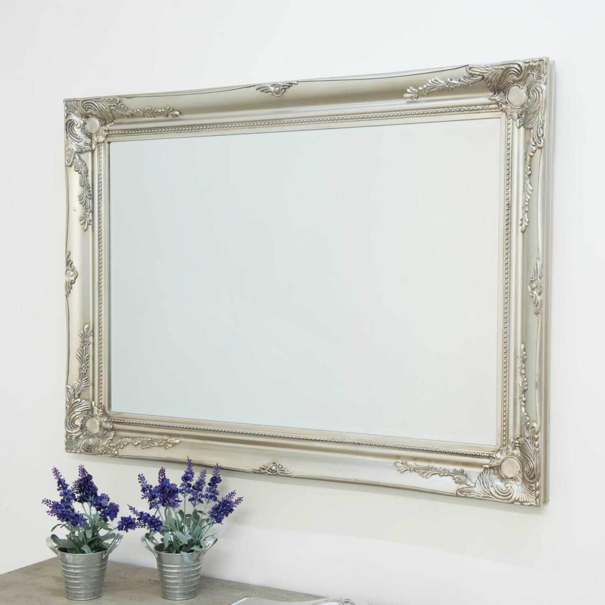 MirrorOutlet classic silver hand-finished french style mirror. The design boasts ornate detailing in all four corners and sides. The mirror glass itself comes bevelled. This particular mirror has a glass size of 3ft x 2ft 91cm x 61cm and has an overall size of 3ft8 x 2ft8 110cm x 79cm.