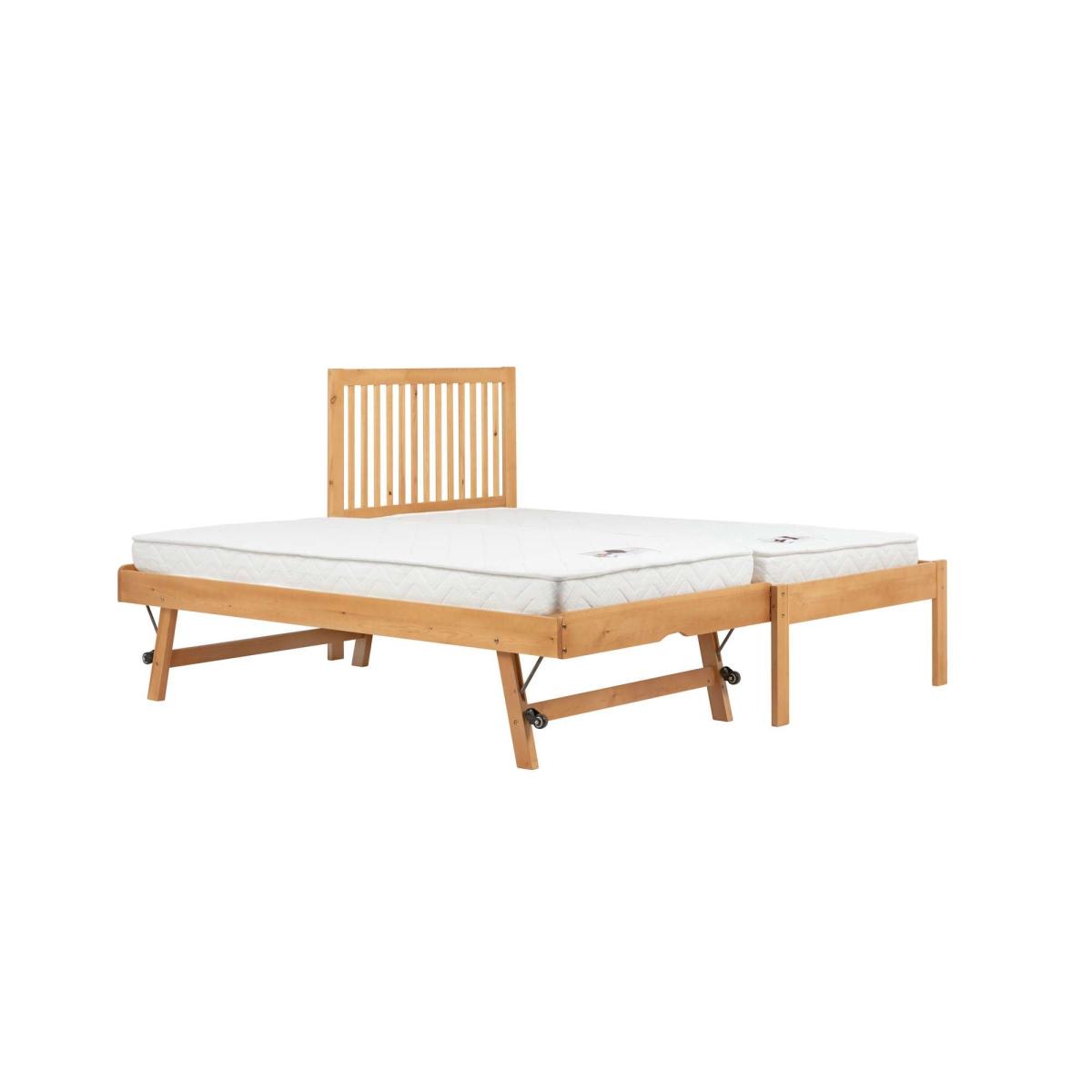 * Modern trundle bed frame* 2 x Single Beds* Sprung slatted base This trundle bed’s framework conceals a hidden trundle bed for additional sleeping space. The pull-out trundle is equipped with castors for easy manoeuvrability and can be used flat or upright. With sprung slatted bases that adapt to pressure points, the Buxton Trundle Bed ensures a comfortable night's rest for your guests while adding a touch of practicality to your bedroom.