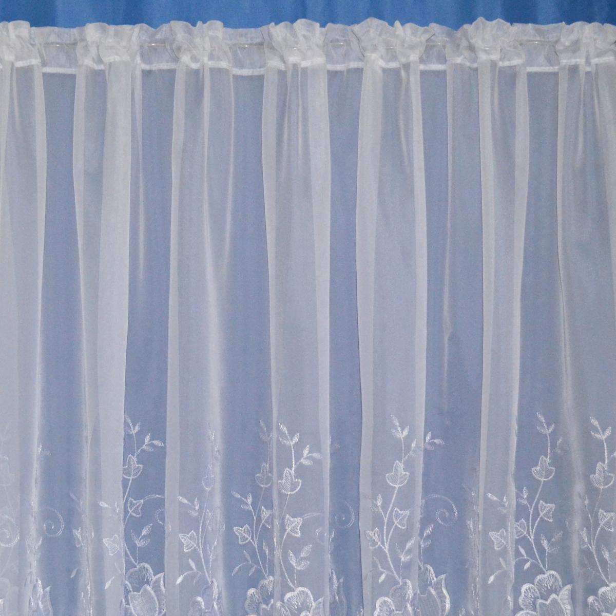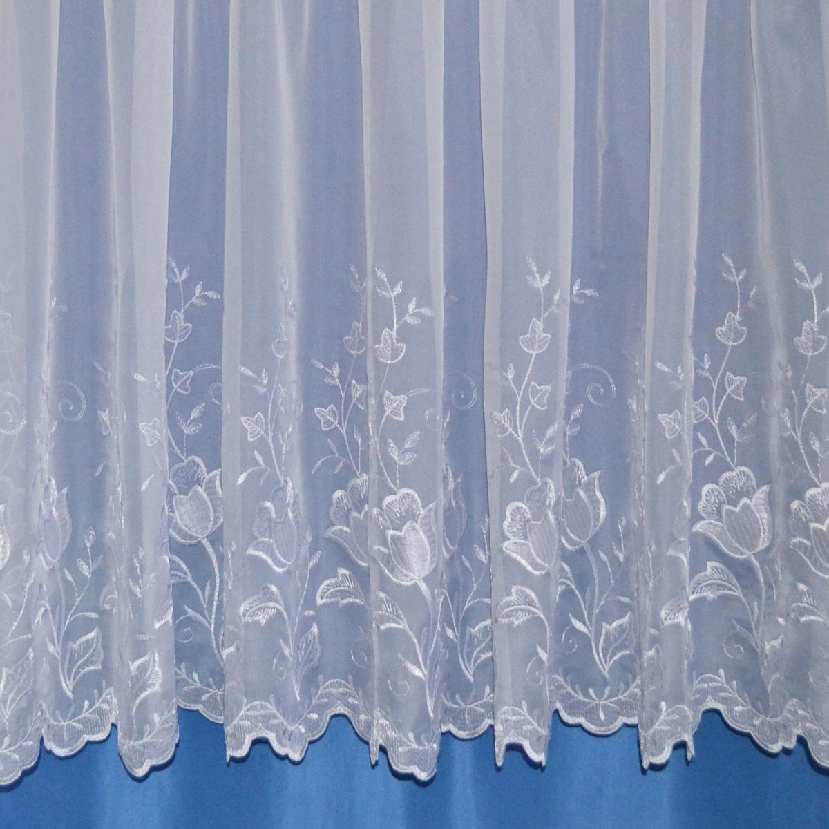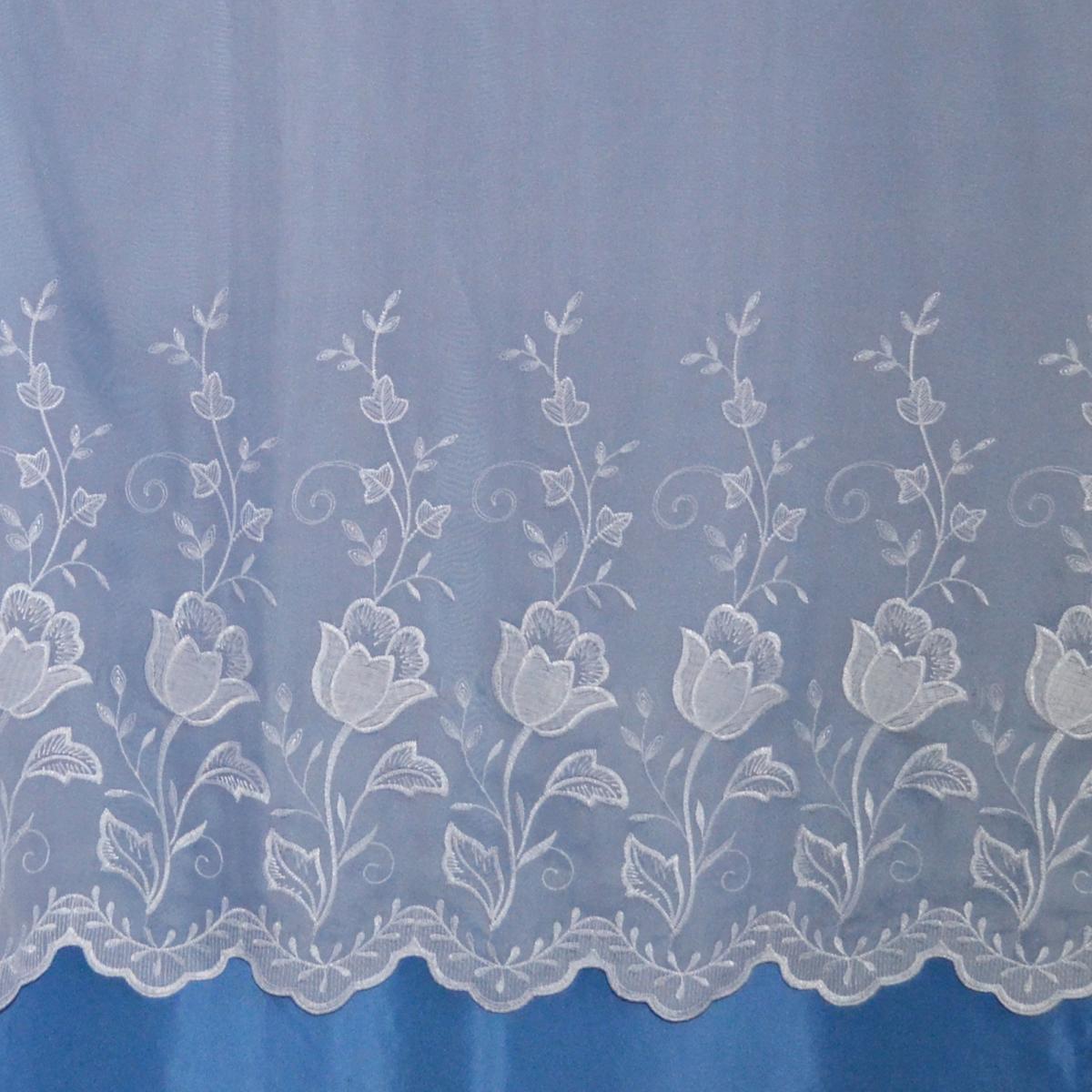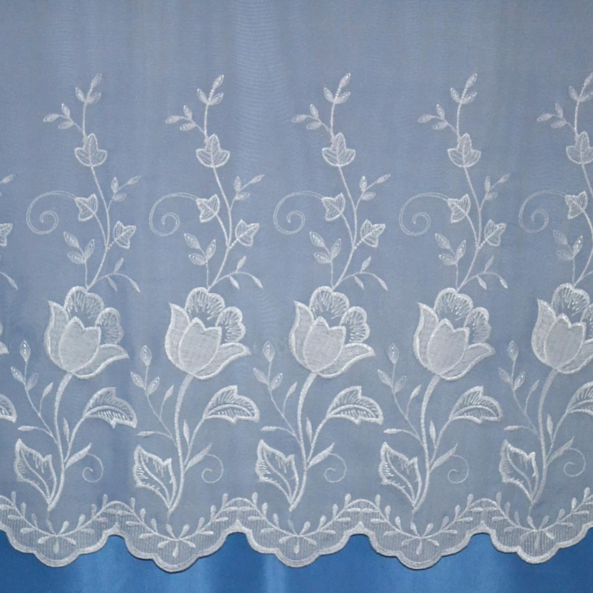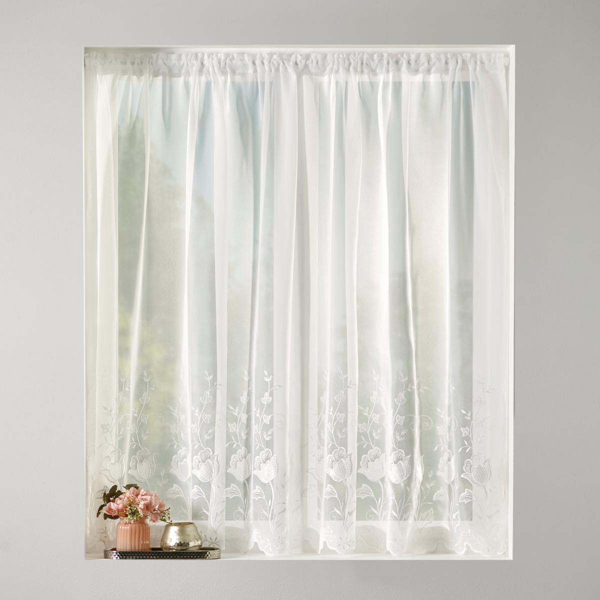 Crafted from white lace, this voile net panel features a flower and leaf pattern and a curved border with floral detailing. 1 quantity = 1 metre. Multiple quantities will be supplied as one continuous piece. Because our fabric by the metre is cut to the size you require, we can only accept returns if the item is faulty (i. E. Damaged or marked).