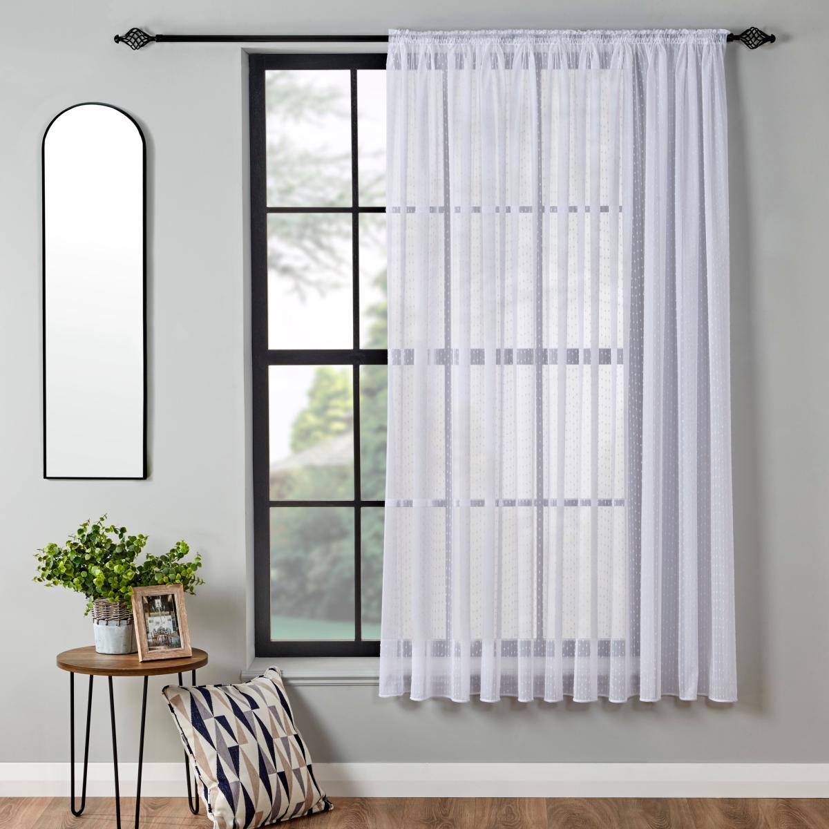 * Sold by the metre* Slot Top* Can be used both inside and outside of the recess* Easy Care - hand wash Beautifully crafted from 100% polyester, this voile boasts a heavy vertical slub lace design with a voile look. The voile has been finished with a slot top which can be hung both inside and outside of the recess. Our Voile offers privacy to your home in style. Easily care for the lace by hand washing when cleaning is required. This Collection is verified by OEKO-TEX and independently tested for harmful substances. It stands for customer confidence and high product safety.**Disclaimers:**1 quantity = 1 metre. Multiple quantities will be supplied as one continuous piece. Because our fabric by the metre is cut to the size you require, we can only accept returns if the item is faulty (i. e. damaged or marked). Please be aware, this is a woven fabric and when cut it will fray unless stitched, therefore some fraying may occur during transit, it is recommended that this product should be stitched on receiving before being hung in the window, this will stop any fraying whilst hung or cleaning.