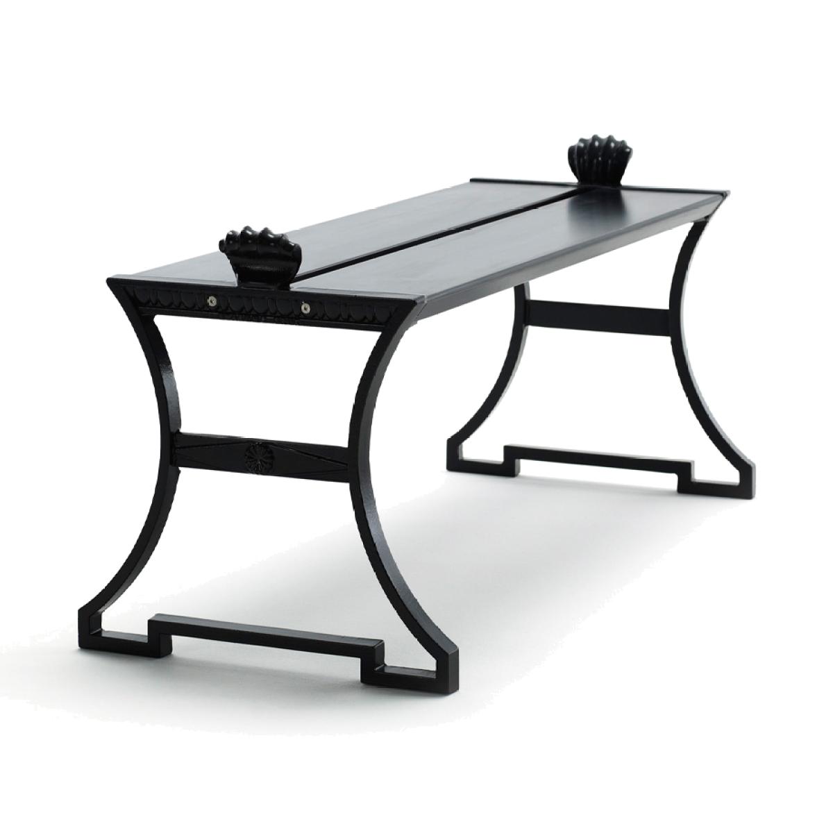 I love this bench for its sleek, minimalist aesthetic and the striking contrast between the black lacquered pine top and stand. It works particularly well in modern or industrial interiors, where its clean lines and bold finish can make a statement without overwhelming the space. Practical styling tips include using it as a hallway seat, a focal point at the foot of a bed, or even as a stylish coffee table in a living room. To keep the look fresh, consider pairing it with neutral toned cushions or decorative objects, such as textured bowls or indoor plants, to add visual interest while maintaining its contemporary edge.
