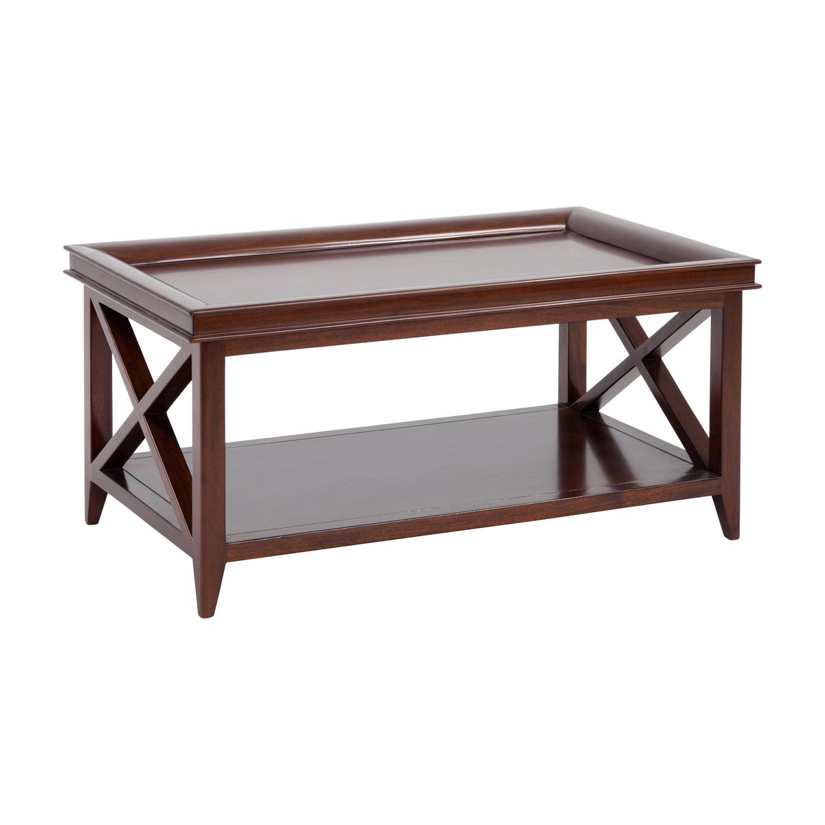 Timelessly elegant, beautifully made coffee table. Crafted from solid mahogany and Mindi wood. With a highly polished antique mahogany finish. Distinctive tray style top and cross beam leg design. Useful lower shelf for magazines and books. Adds chic, glossy style to the modern or classic home