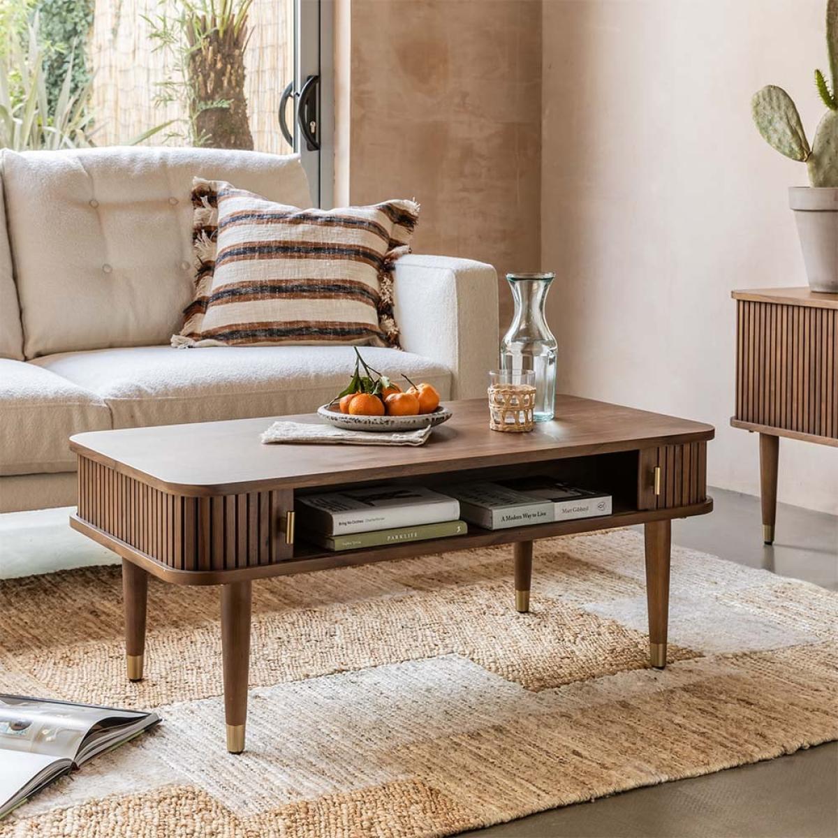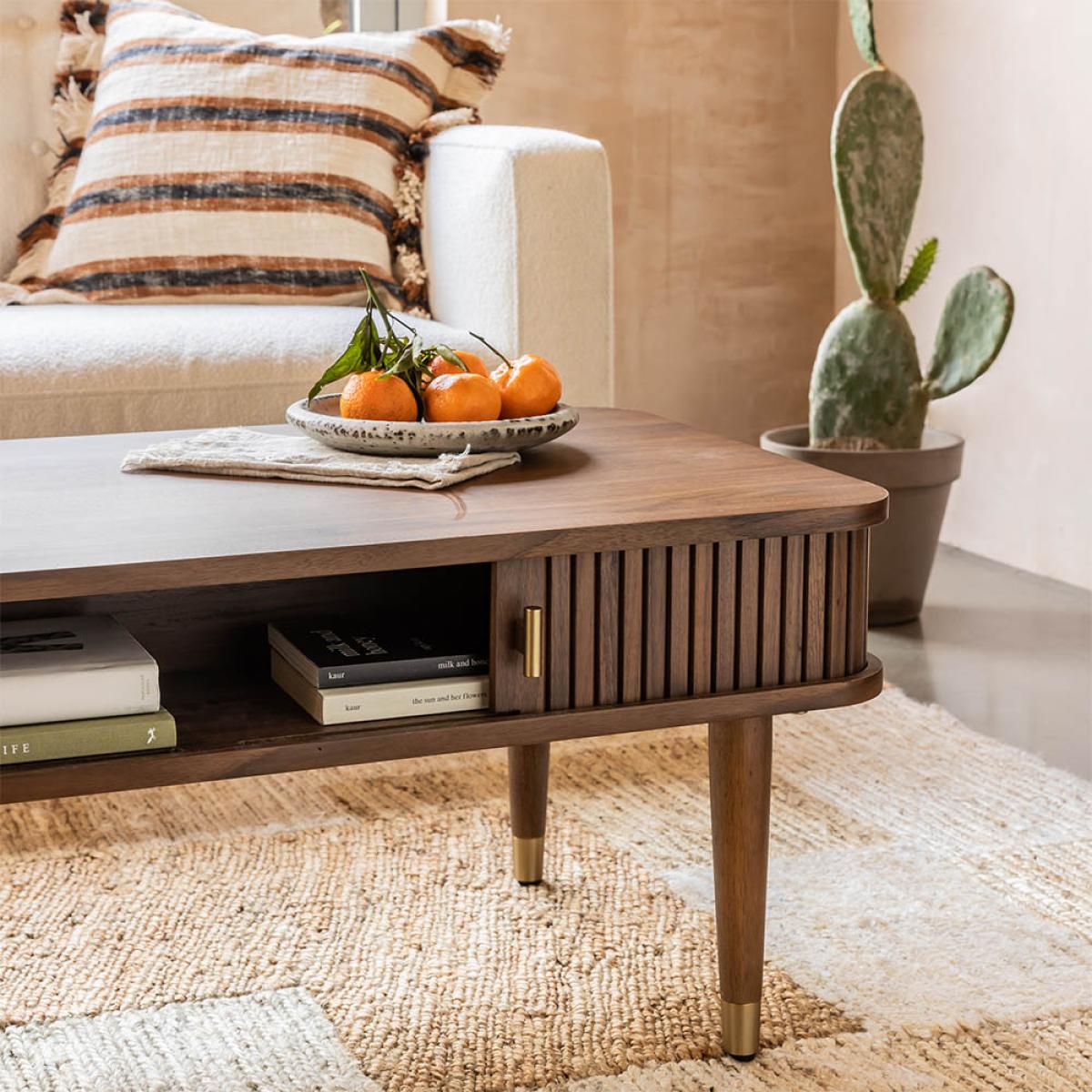 Bring the mid-century look into your living space with our vintage-feel Byron Coffee Table, crafted from warm walnut veneer with solid T-bar brass handles and tapered legs with matching brass detail. For discreet storage for TV remotes and more, there are two tambour slatted doors that smoothly slide open to reveal practical storage space inside. Our Byron collection also includes an extendable dining table, sideboard, media unit and side table.