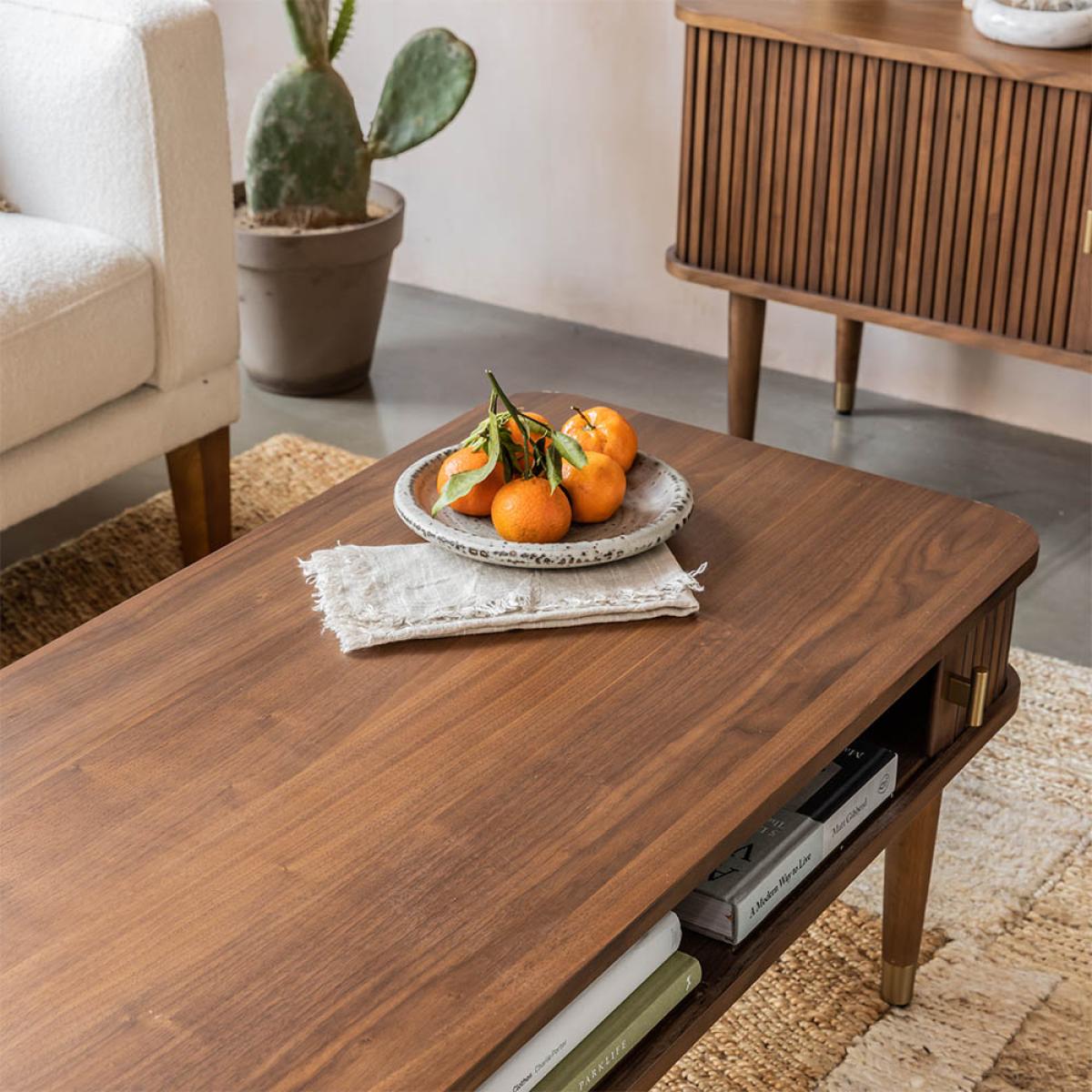 I’m a big fan of the Byron table for its neat storage compartment and warm walnut finish - it keeps clutter out of sight while adding a mid-century edge. Its slim legs and subtle fluting sit nicely in Scandi, contemporary or transitional schemes, and the compact footprint makes it ideal for smaller lounges or as a second table in larger open plans. Styling tips: anchor the table with a shallow tray to corral remotes and coasters, then add a low-profile vase or sculptural candle. Glossy magazines or a hardback coffee-table book stack work well alongside a small botanical sprig to introduce texture without overcrowding.