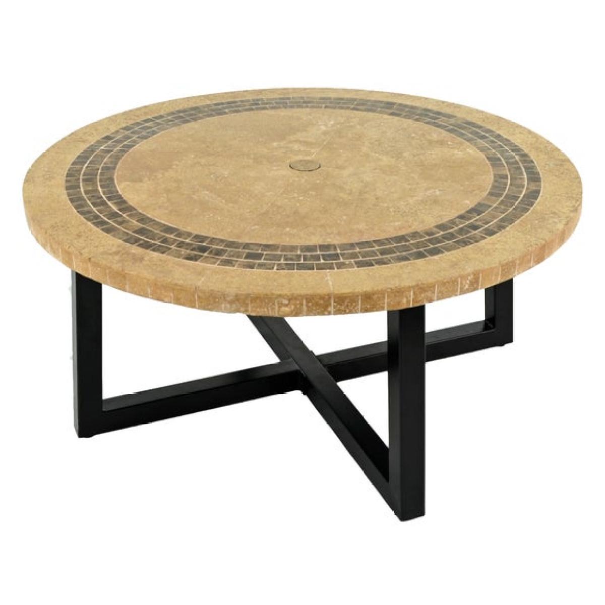* 110cm diameter * Seats 4 comfortably * Hald-laid Travertine marble top * Sturdy steel frame The Byron Manor Victoria Round Coffee Table adds a refined touch with its hand-laid travertine marble top in soft beige, framed by a warm brown mosaic border. Each table has its own unique pattern, making it one of a kind. Steel legs with adjustable feet keep it steady, even on uneven ground. With a spacious 1.1m diameter, it comfortably seats four for relaxed outdoor or indoor gatherings. Built for durability and easy to assemble, it's a stylish option for versatile living spaces.