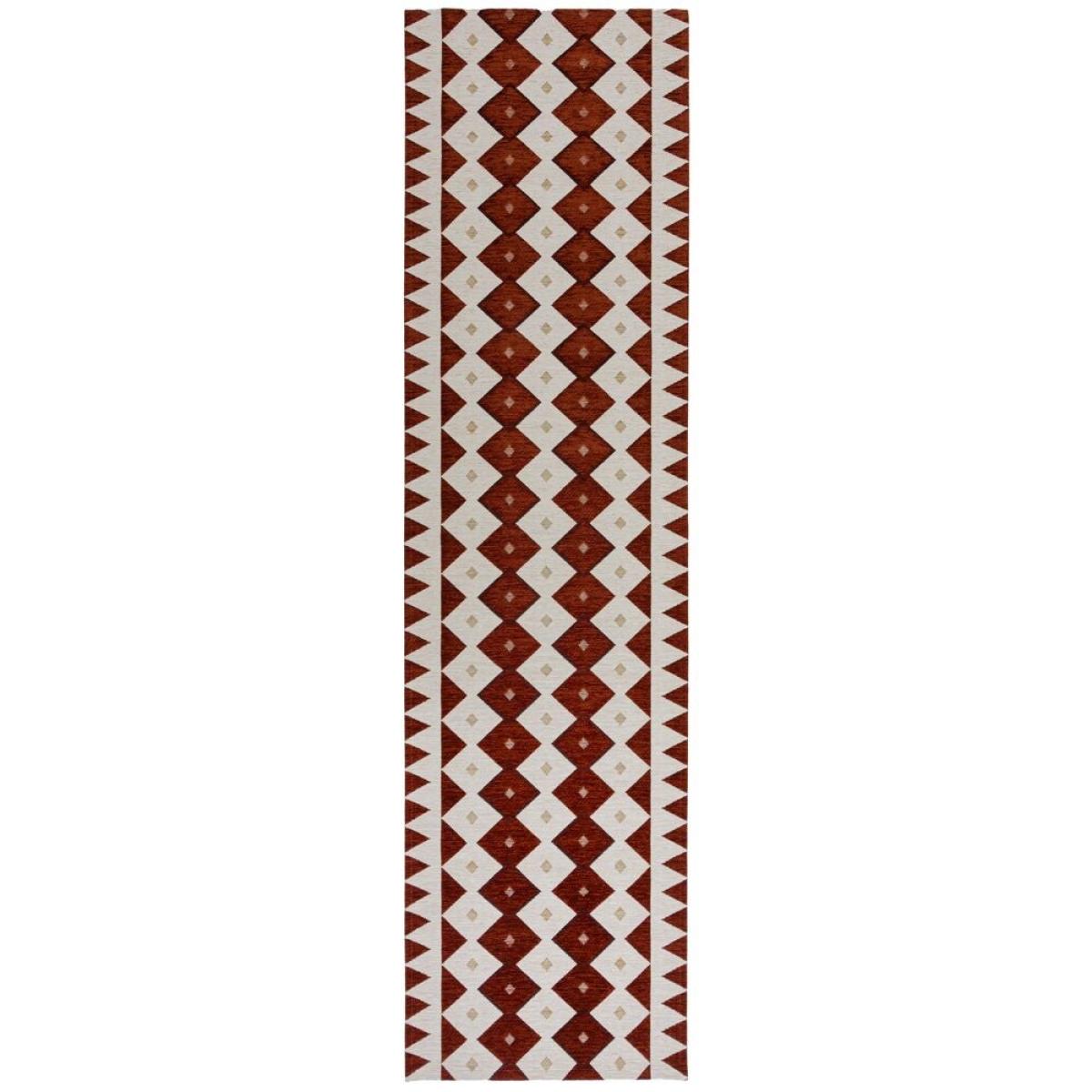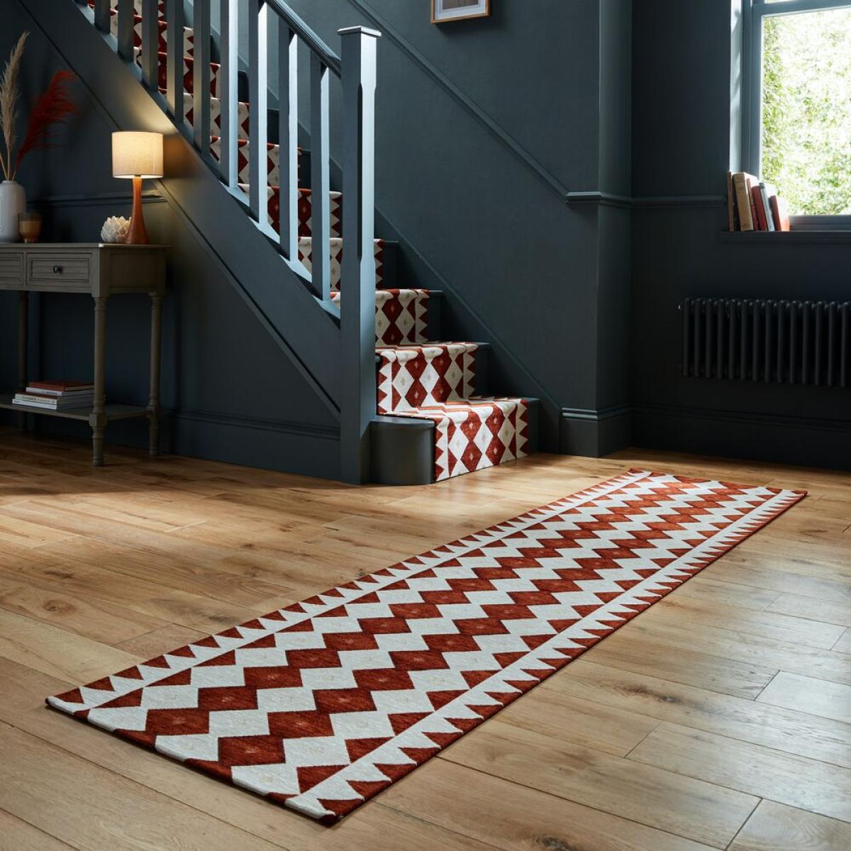 I love this runner for its bold geometric pattern and vibrant orange hue - it instantly adds personality to any hallway or narrow space. It works particularly well in contemporary and eclectic interiors, providing a striking contrast to more neutral tones or complementing warm wooden flooring. Practical styling tips include layering it over a plain rug for added dimension or keeping the surrounding décor minimalist to let the pattern stand out. It also works well paired with simple furniture and neutral wall colours, making it a versatile choice for creating a lively yet balanced look in your home.