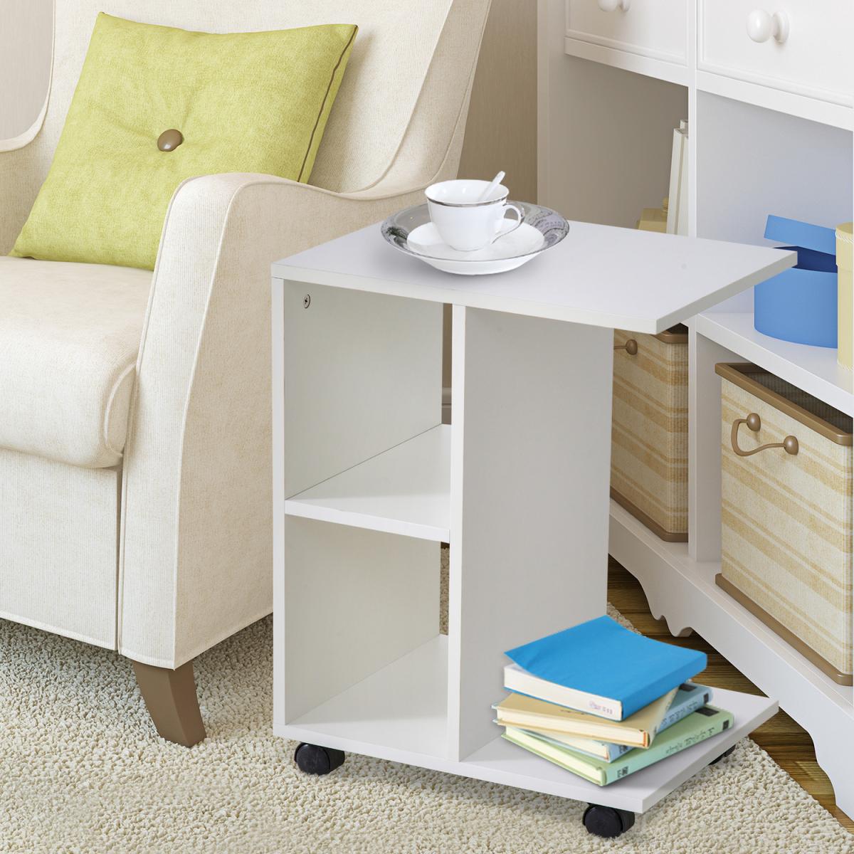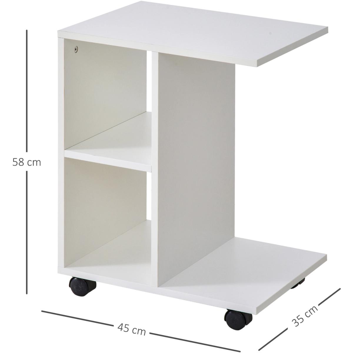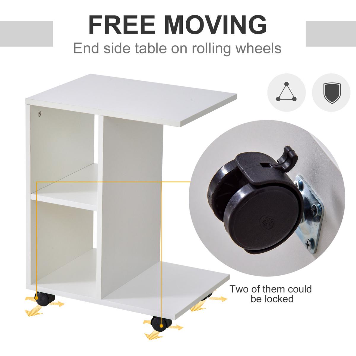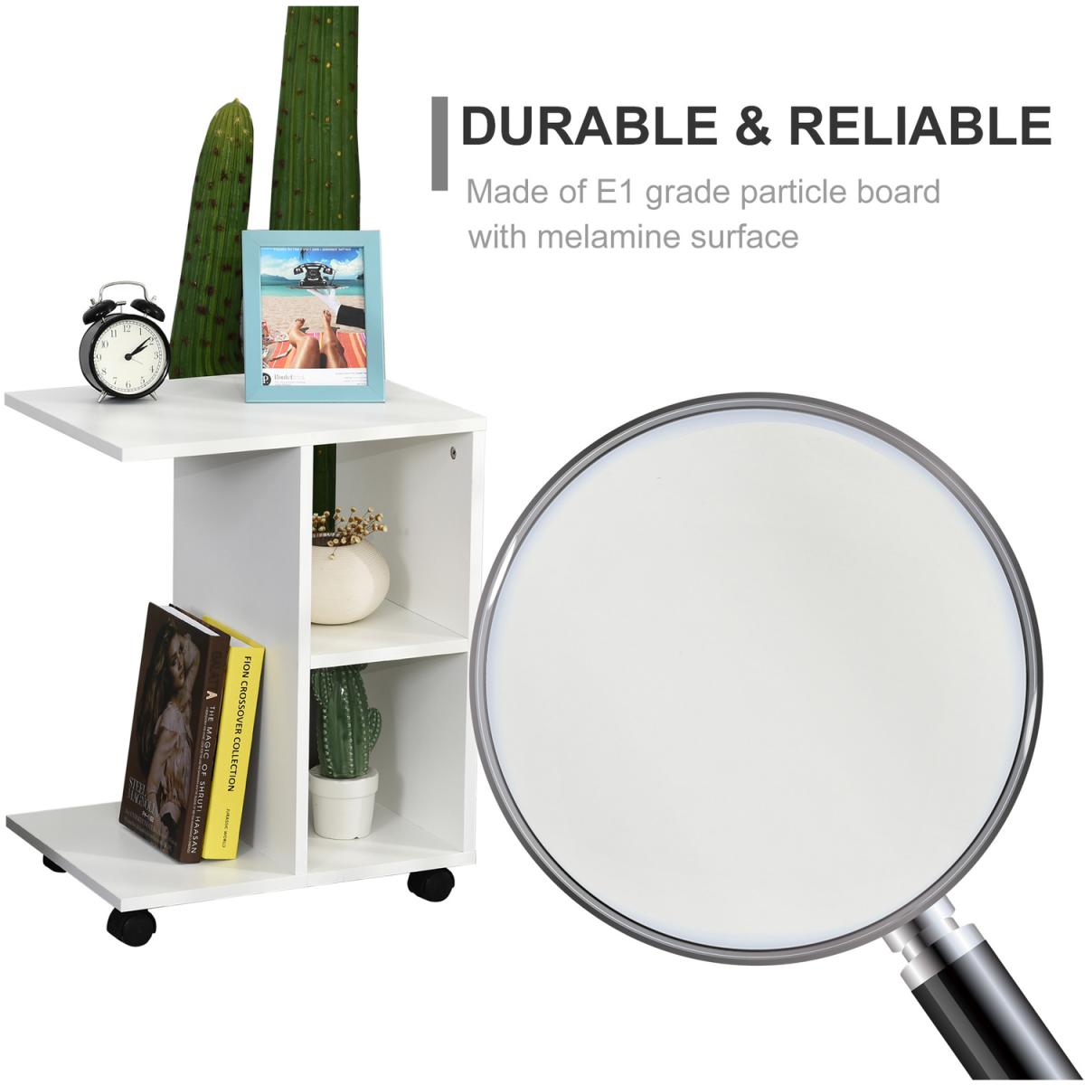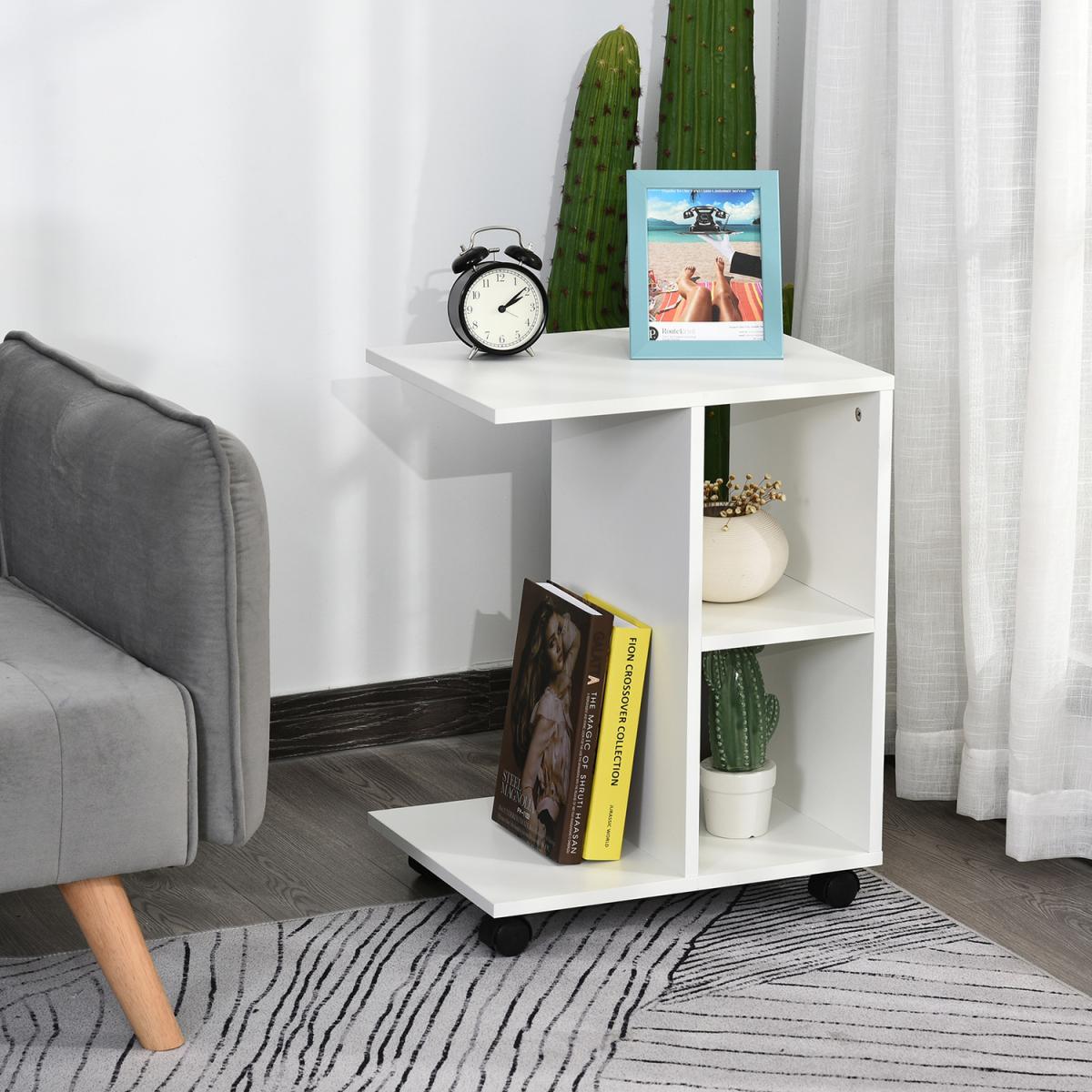 Let the unique design of this C table, from HOMOM, lead the way for keeping your home tidy. Made from solid particleboard, this piece is very durable and reliable for everyday use, featuring two open shelves for storage and display. The open end can be used as both extra storage and slotting into spots to extend the surface space, with the four wheels allowing it to move easily, two can be locked to keep the table in place. It is finished with a melamine coating, making it smooth, protected against light markings and easy to clean.