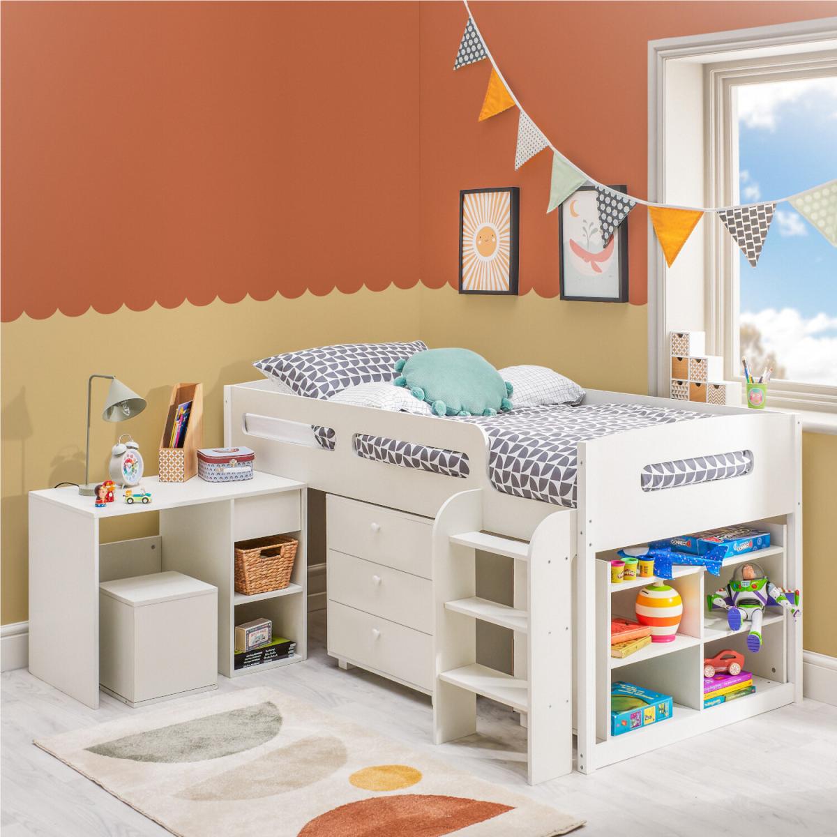 Cabin bed with an abundance of storage and functions. Includes integrated set of 3 drawers for clothes storage, Bookshelf unit for books, toys & games. Stool & Desk with space for drawing & stationary storage in 2 shelves and drawer. Finished in a crisp smooth white wood that will slot into any child's bedroom. Smooth simple lines & compact combined furniture set has a small footprint with all the functions of 4 pieces of furniture. Solid steps for easy access to the bed for younger kids. Soft edges and recessed handles make the bed safe for all users of all ages. Full-length guard rails on all sides are finished in non-toxic paint. Made from high-grade pine wood with thick panels. Extra thick legs keep the bed stable and solid. The robust slatted base supports weigh a large 180kg weight limit of sleeper and mattress. Pocket Sprung Mattress -Thick 16cm Luxury pocket sprung mattress with independent pocket springs to adapt to weight. Breathable cool touch hypoallergenic cover, anti-dust and anti-mite. High-density foam top sleeping layer - medium-firm rating.