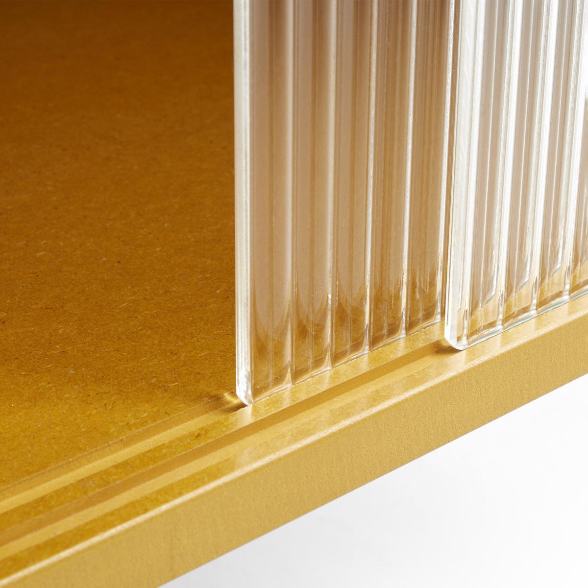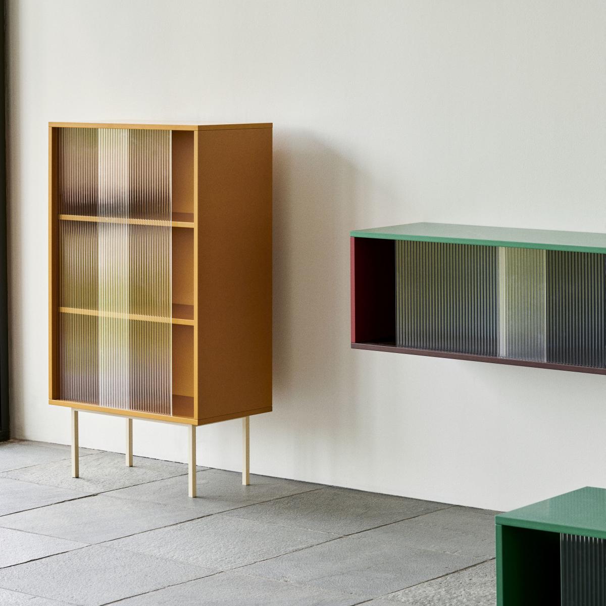 The Colour Cabinet collection was created by the world-renowned Belgian duo of Muller Van Severan, and is part of the current icon list. From galleries to museums, not to mention collectors… They all love their joyful, colourful and timeless creations with radically minimalist lines. Inspired by the Bauhaus movement and the work of Donald Judd, the Colour Cabinet storage collection plays on the contrast between the minimalism of the lines and the vibrant generosity of the colours, which highlight the beauty of the dope-dyed material. Modern and full of zest, the colour palette has been exactingly selected to accentuate the strict, primary shapes of the units. Each piece is both functional and fun. The compartments come in various sizes, with or without legs, with or without sliding doors in ribbed glass. The various versions mean there are countless ways to use this piece: Wall shelf, bedside table, sideboard, TV unit or cabinet. Colour Cabinet contains a blend of joyful intensity and remarkable sobriety, along with poetry and geometry. The Colour Cabinet storage units are made in Vlachromat: A dope-dyed and varnished wood fibre panel. The fibres are soaked with organic colours and chemically bound together by a special resin.