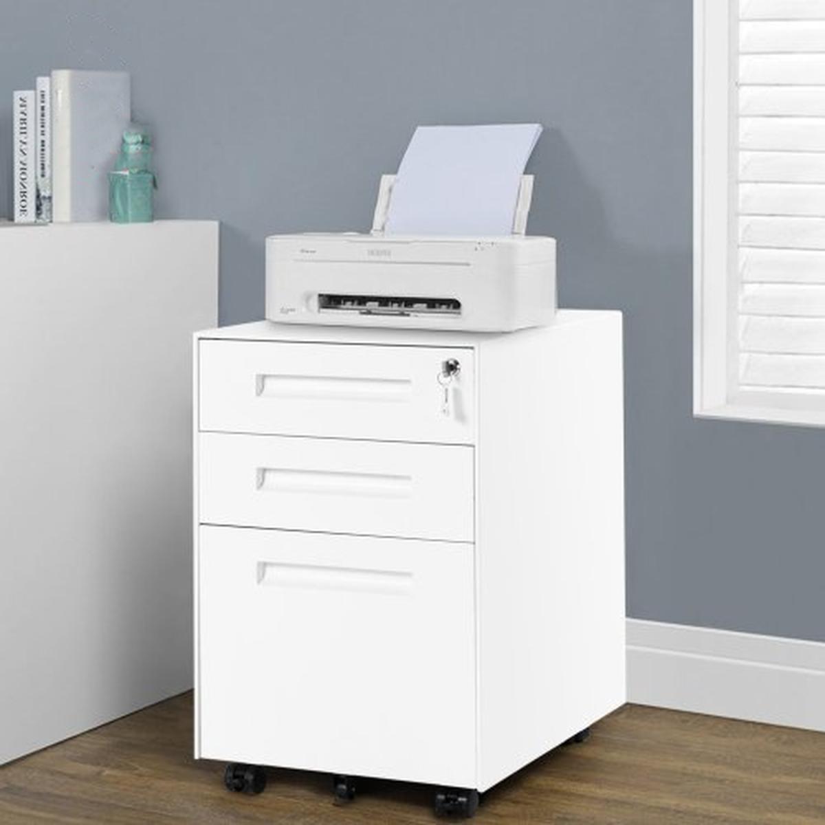 This metal vertical file cabinet is the ideal storage solution for any small office or home office. Durably constructed with steel and a white baked-enamel finish, equipped with a key to take care of your privacy and safety of documents. This rolling file cabinet is easy to move with 5 rolling wheels and this storage cabinet's built-in sliding rail helps you open and close the drawer smoothly, which is a great design for office workers to create a quiet environment.