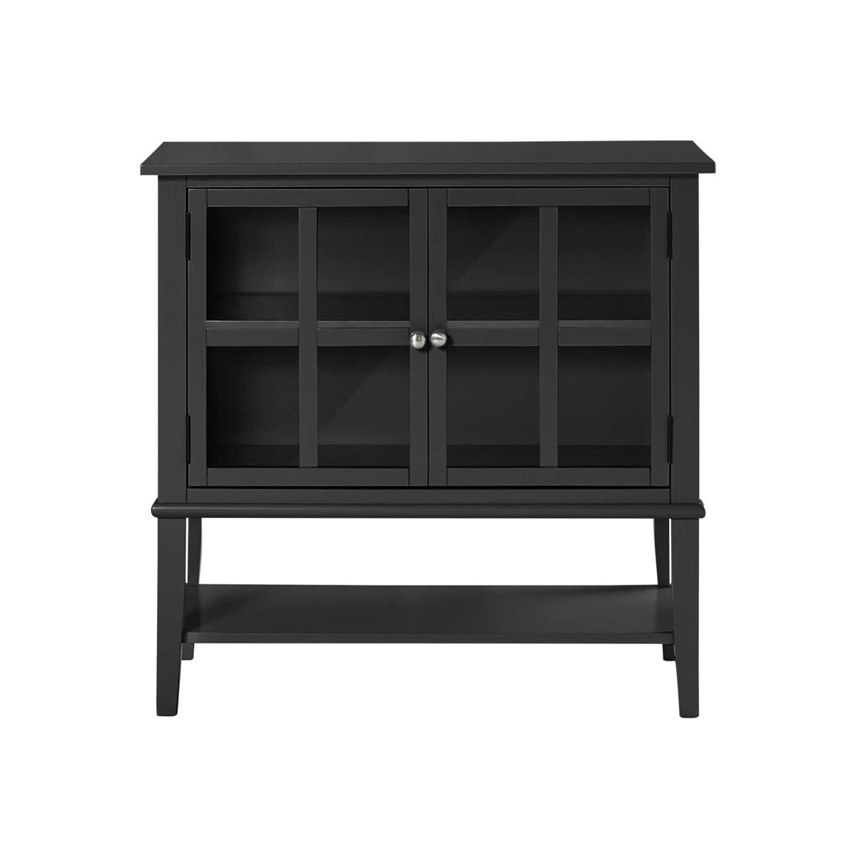 Get storage where you need it with the Franklin 2-Door Storage Cabinet. Made of painted MDF and solid wood legs, the black finish can easily be added to your existing decor. The 2 glass doors feature a mullion frame for a decorative touch and adjustable euro hinges. The decorative moulding and tapered legs give this Cabinet an elegant look for an instant upgrade for your living space. The top surface is perfect for displaying photos and decorations and the open lower shelf gives you extra storage. The 2 shelves, 1 adjustable, can organize board games, blankets, or extra linens. The Cabinet can also be used as a small buffet to store fine china, silverware, and cups. Get creative and use the Cabinet however, you see fit.