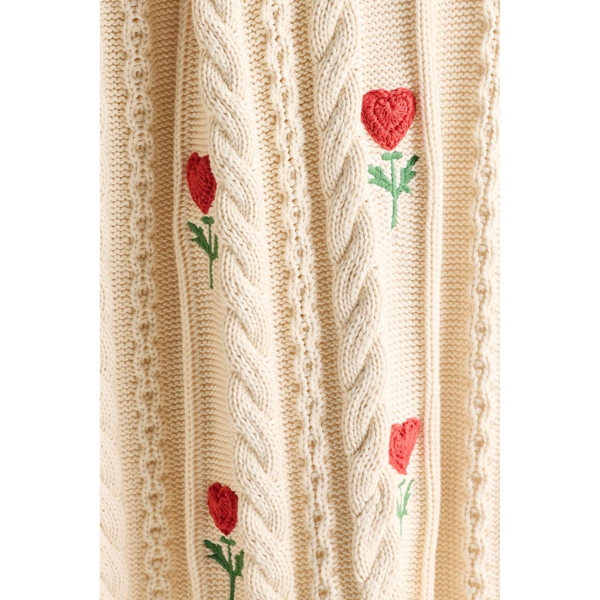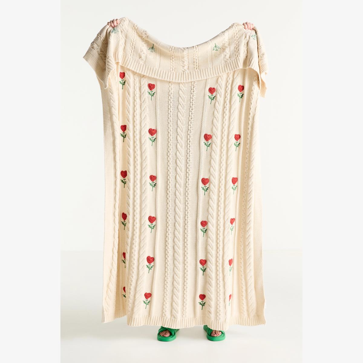 Rose icons lend a sweet touch to this classic cable-knit blanket, perfect for a little extra warmth during breezy days. * 100% Cotton * Responsibly made: This product was tested for harmful substances and certified according to OEKO-TEX® standards * Light weight * Perfect for breathable warmth * Machine wash * Imported