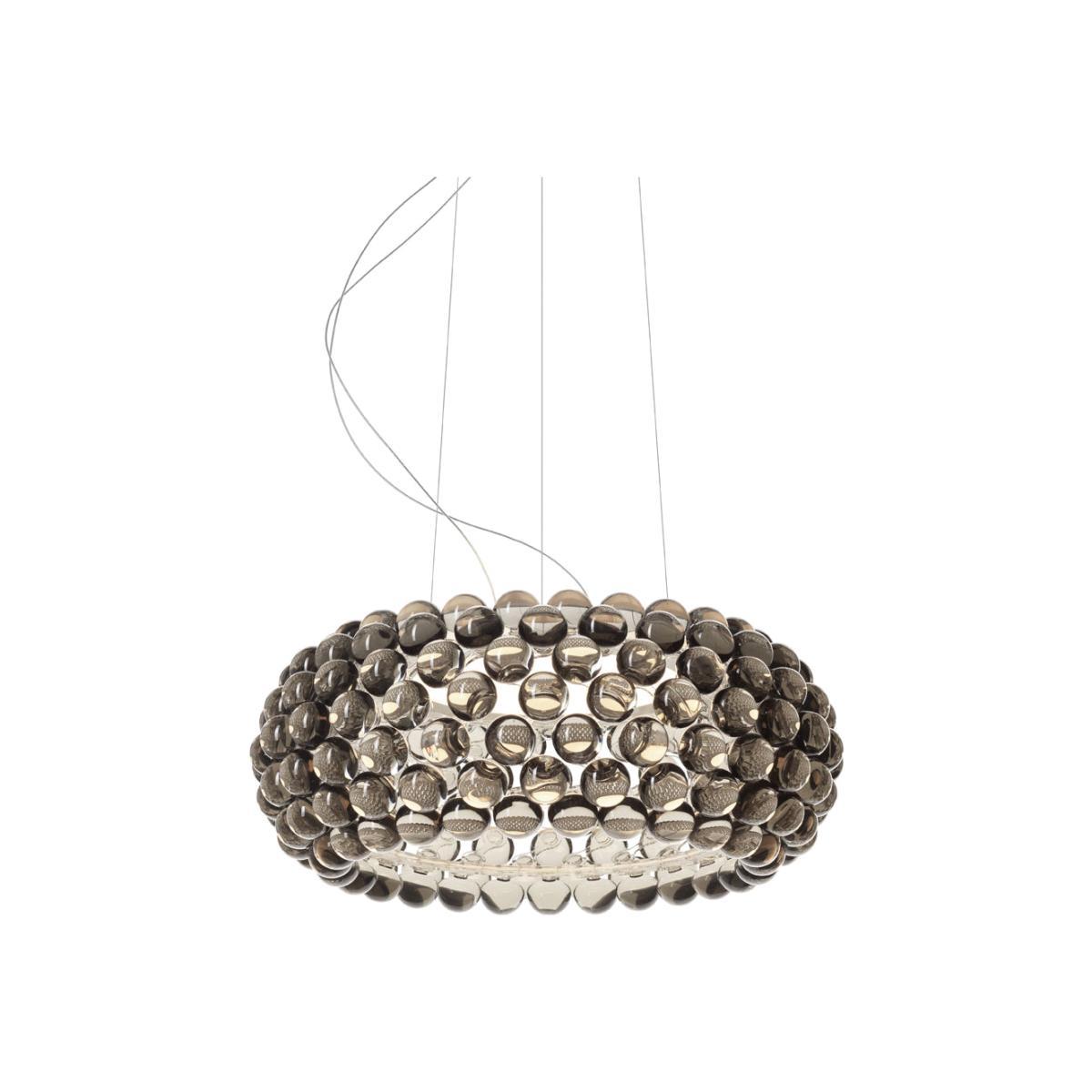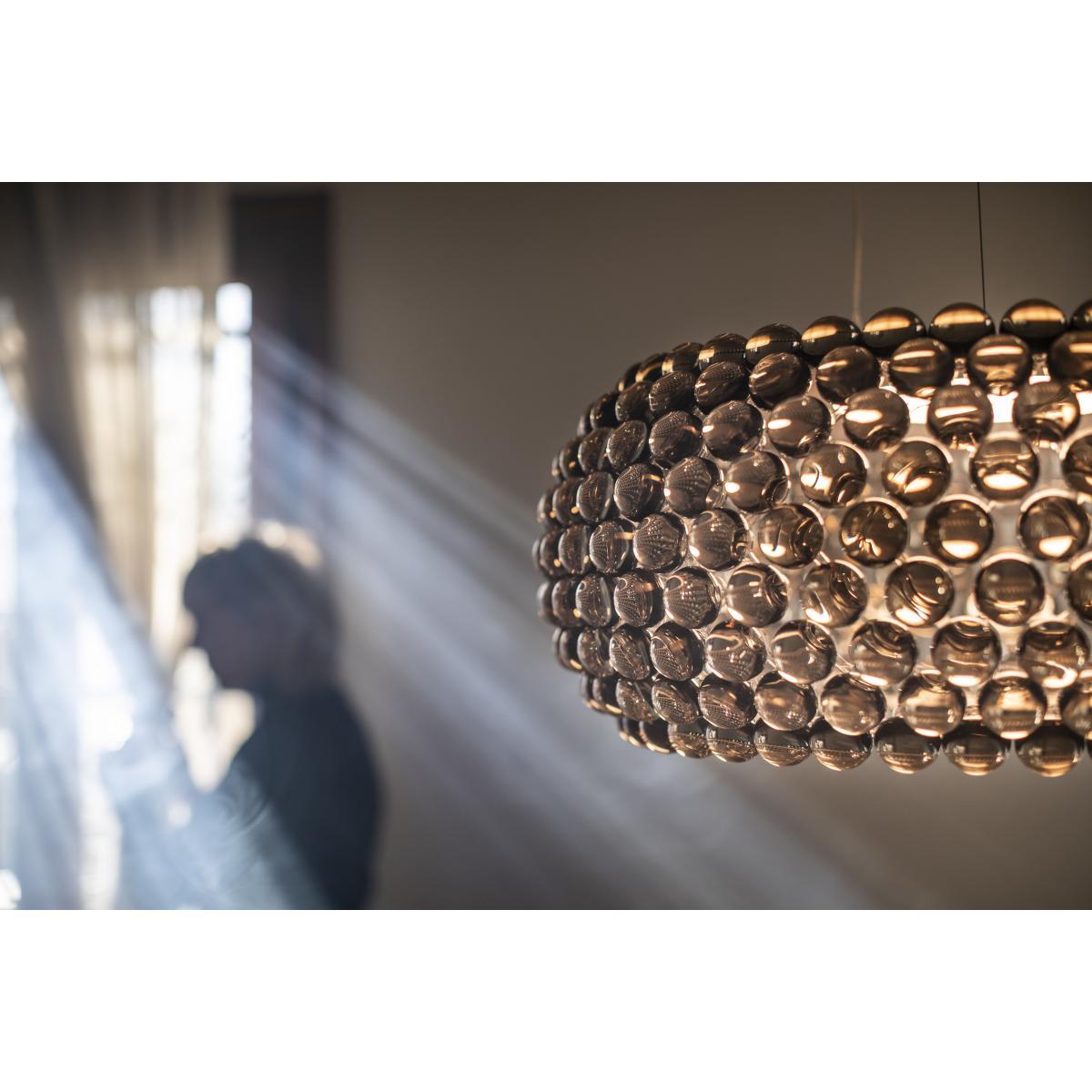 Evolution of an icon for a limitless light. Designed by Patricia Urquiola and Eliana Gerotto, Caboche was created in 2005, based on a strong and simple intuition: creating a light with a look that it as pretty, sophisticated and light as a pearl bracelet. From its beginnings, Caboche stood out as one of the top Foscarini best-sellers, until it became a real icon. Caboche Plus is a new version, completely revisited relying on modern technology. More transparency and brightness, for lighter lines. The multiple PMMA spheres appear to float in space, in a wonderful effect of complete transparency. A piece with a great visual impact, capable of combining lightness and decorative and practical value. Caboche Plus has new zigzag-shaped rings that are quite simply invisible and do not hide the light or the view. They enhance the transparency while improving the resistance. Once the spheres are assembled, the rings disappear from view completely, only allowing pearls of light to appear. Caboche Plus has a new Twist-lock fixing system which allows for simpler and more stable installation. This bayonet fixing system allows the brilliant look of the spheres to shine and makes insertion easier, as such guaranteeing absolute stability with a simple click. With this new mount, the light is emitted without interference inside the spheres, to light up the space in all directions. A technological and creative gem, the new, next-gen double-sided LED group of lights designed by Foscarini grants Caboche Plus an impeccable lighting with optimal performance in terms of energy efficiency (excellent colour reproduction index, same bright tone as a halogen source, energy efficiency improved by up to 40%). Brilliant and multifaceted, the Caboche Plus pendant is a mosaic of spheres, a perfect fusion of individual parts which, together, form the body of the lamp and create its light effect. The multiple transparent and sparkling spheres increase the light and enrich it with wonderful reflections. A central diffuser made from white satin-finish blown glass bolsters this impression of a heavenly body. This version is dimmable. Available in a NON-dimmable version.