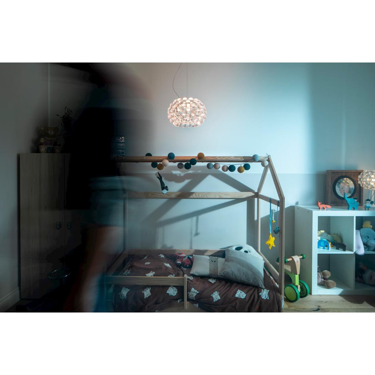 Evolution of an icon for a limitless light. Designed by Patricia Urquiola and Eliana Gerotto, Caboche was created in 2005, based on a strong and simple intuition: creating a light with a look that it as pretty, sophisticated and light as a pearl bracelet. From its beginnings, Caboche stood out as one of the top Foscarini best-sellers, until it became a real icon. Caboche Plus is a new version, completely revisited relying on modern technology. More transparency and brightness, for lighter lines. The multiple PMMA spheres appear to float in space, in a wonderful effect of complete transparency. A piece with a great visual impact, capable of combining lightness and decorative and practical value. Caboche Plus has new zigzag-shaped rings that are quite simply invisible and do not hide the light or the view. They enhance the transparency while improving the resistance. Once the spheres are assembled, the rings disappear from view completely, only allowing pearls of light to appear. Caboche Plus has a new Twist-lock fixing system which allows for simpler and more stable installation. This bayonet fixing system allows the brilliant look of the spheres to shine and makes insertion easier, as such guaranteeing absolute stability with a simple click. With this new mount, the light is emitted without interference inside the spheres, to light up the space in all directions. A technological and creative gem, the new, next-gen double-sided LED group of lights designed by Foscarini grants Caboche Plus an impeccable lighting with optimal performance in terms of energy efficiency (excellent colour reproduction index, same bright tone as a halogen source, energy efficiency improved by up to 40%). Like a bracelet of sparkling and transparent pearls, supported by an elegant and light base, the Caboche table lamp enhances any setting. A central diffuser made from white satin-finish blown glass bolsters this impression of a heavenly body.
