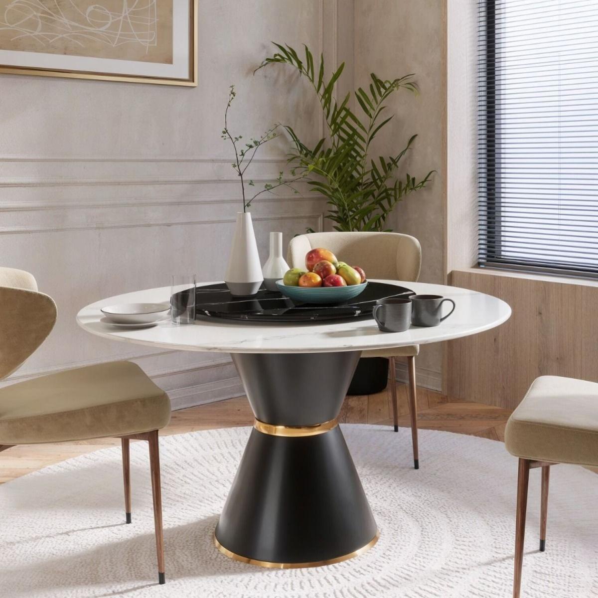 The exquisite Caceres round stone dining table, where cutting-edge design meets luxurious functionality. Crafted to perfection, this masterpiece boasts a solid sintered stone top that exudes sophistication while offering unparalleled durability. The non-porous surface ensures that your table remains hygienically pristine and effortlessly easy to clean, while its UV resistance guarantees a lifetime of vibrant elegance without the threat of discoloration. At its heart, a convenient black sintered stone turntable enhances both style and utility. Anchored upon a stunning black carbon steel base, accentuated by opulent gold rings, this table is not merely a piece of furniture, but an artful centrepiece for your home.