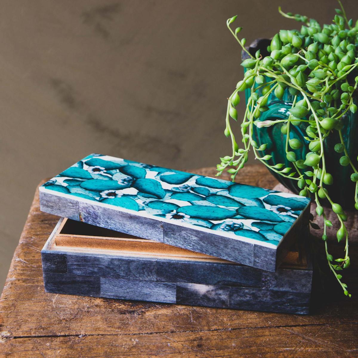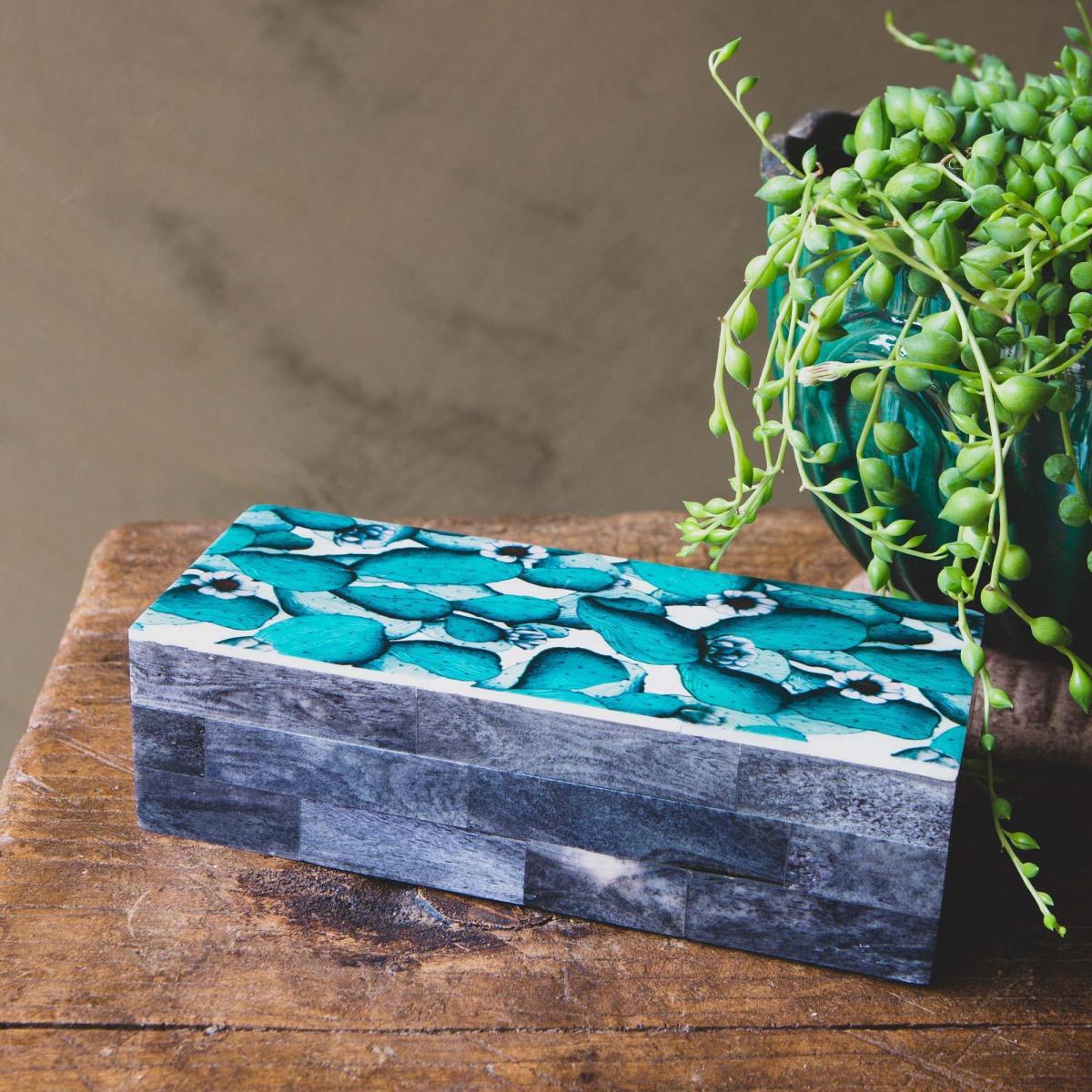 Our printed cactus box is inspired by the desert and made from natural bone and Indian Sheesham wood. Featuring a detailed and colourful cactus print, this inlaid box makes a decorative way to keep small items, jewellery and trinkets.