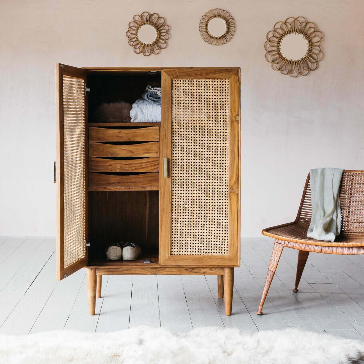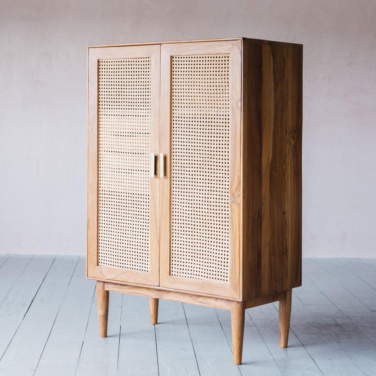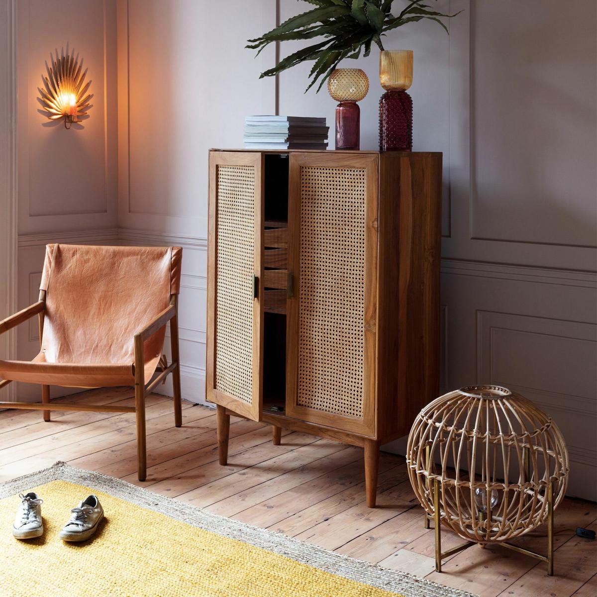I love this little cupboard for its versatile and warm aesthetic, making it a great addition to both contemporary and rustic interiors. Its wooden finish and cane-front panels lend a subtle texture that can soften the look of a room, making it ideal for living rooms, bedrooms, or even hallways. For styling tips, pair it with natural materials like linen, wicker, or woven baskets to enhance its organic charm. It works well in spaces where you want to create a cosy feel but still maintain a functional storage solution - think arranging it with decorative trays or plants on top to add personality and colour. Its mid-century vibe also means it can slot into eclectic interiors seamlessly, offering both style and practicality.