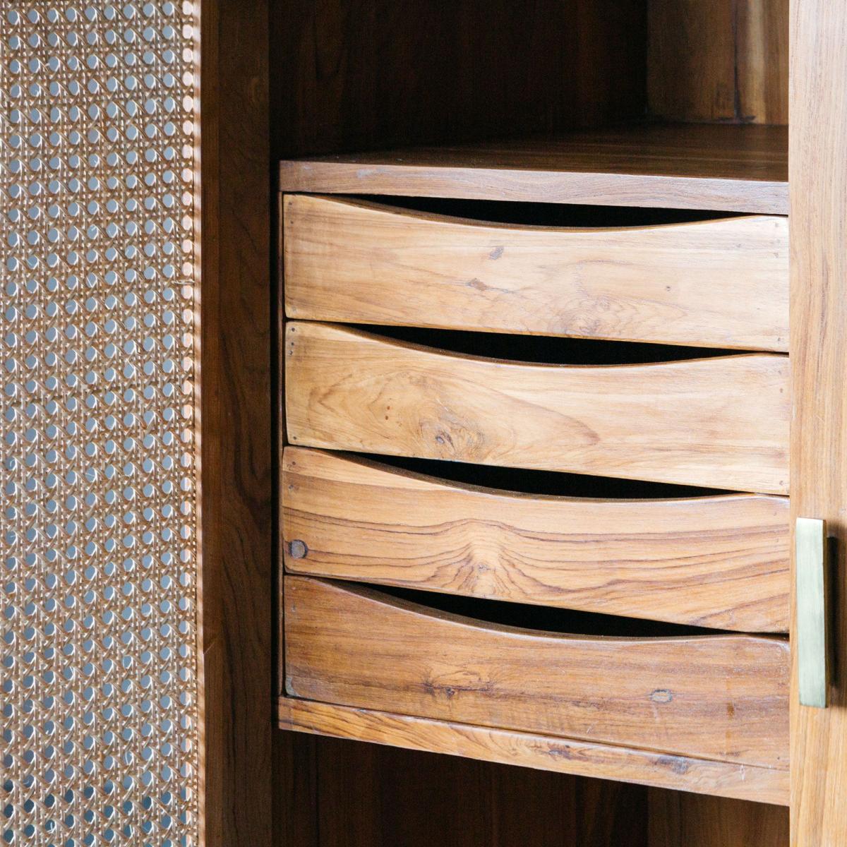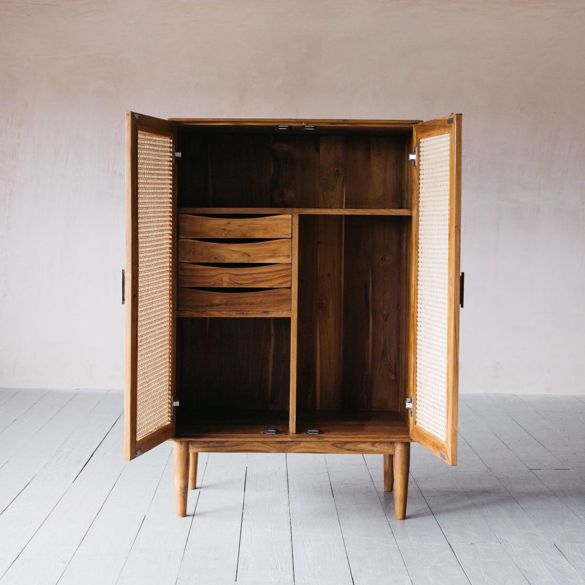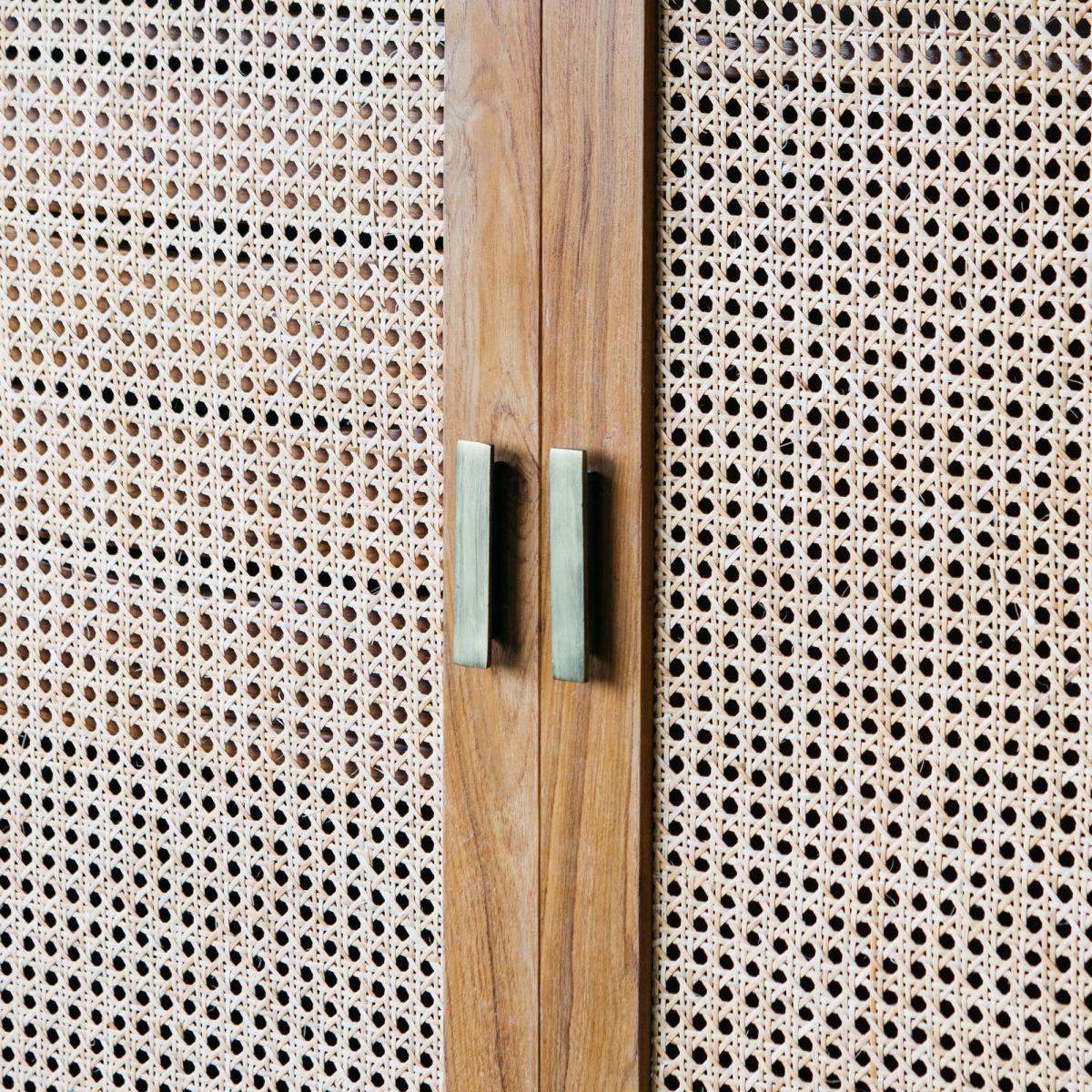 I love this little cupboard for its versatile and warm aesthetic, making it a great addition to both contemporary and rustic interiors. Its wooden finish and cane-front panels lend a subtle texture that can soften the look of a room, making it ideal for living rooms, bedrooms, or even hallways. For styling tips, pair it with natural materials like linen, wicker, or woven baskets to enhance its organic charm. It works well in spaces where you want to create a cosy feel but still maintain a functional storage solution - think arranging it with decorative trays or plants on top to add personality and colour. Its mid-century vibe also means it can slot into eclectic interiors seamlessly, offering both style and practicality.