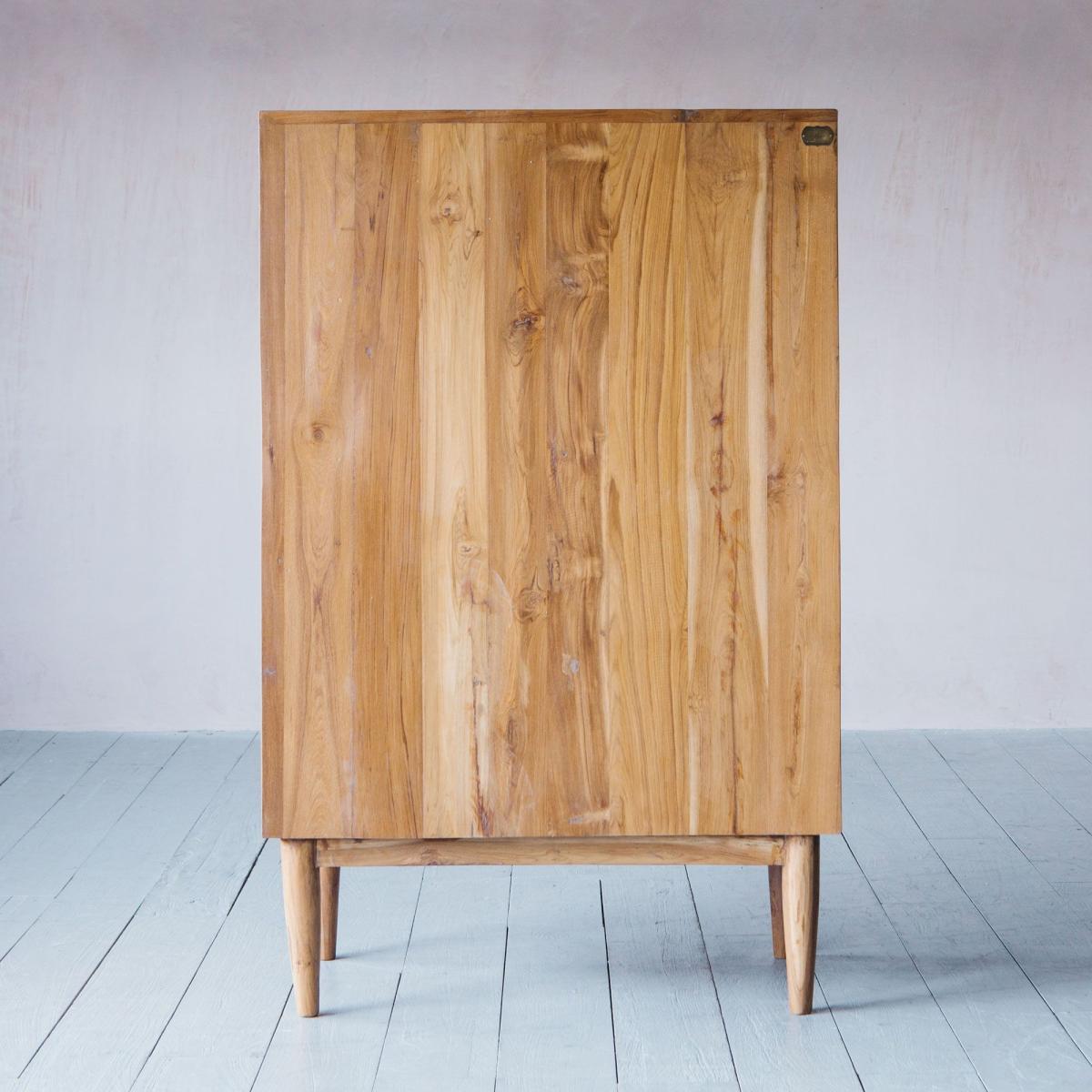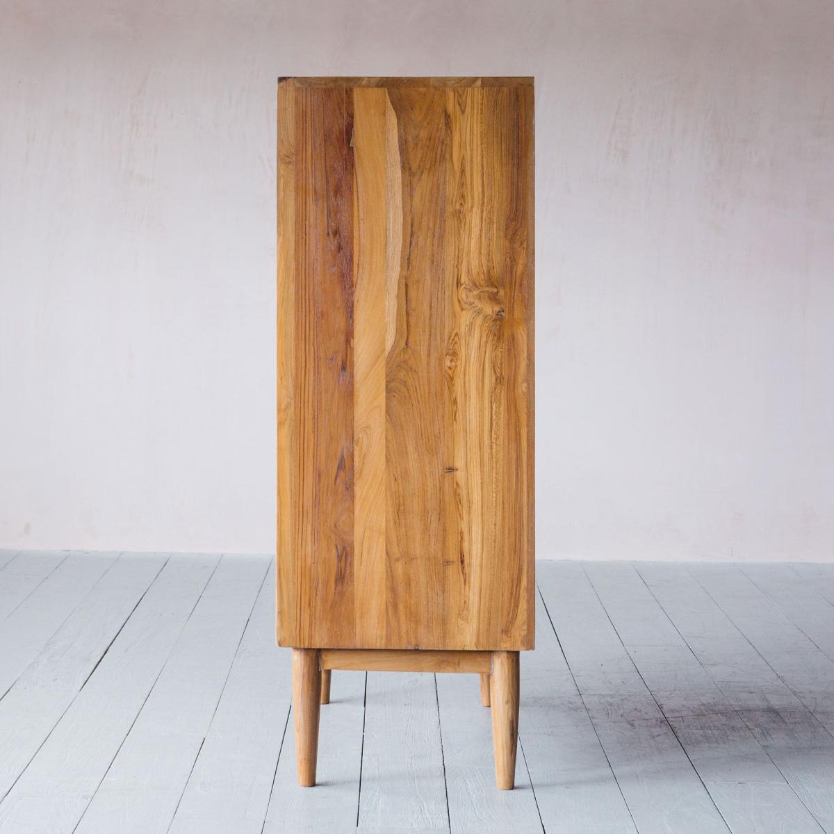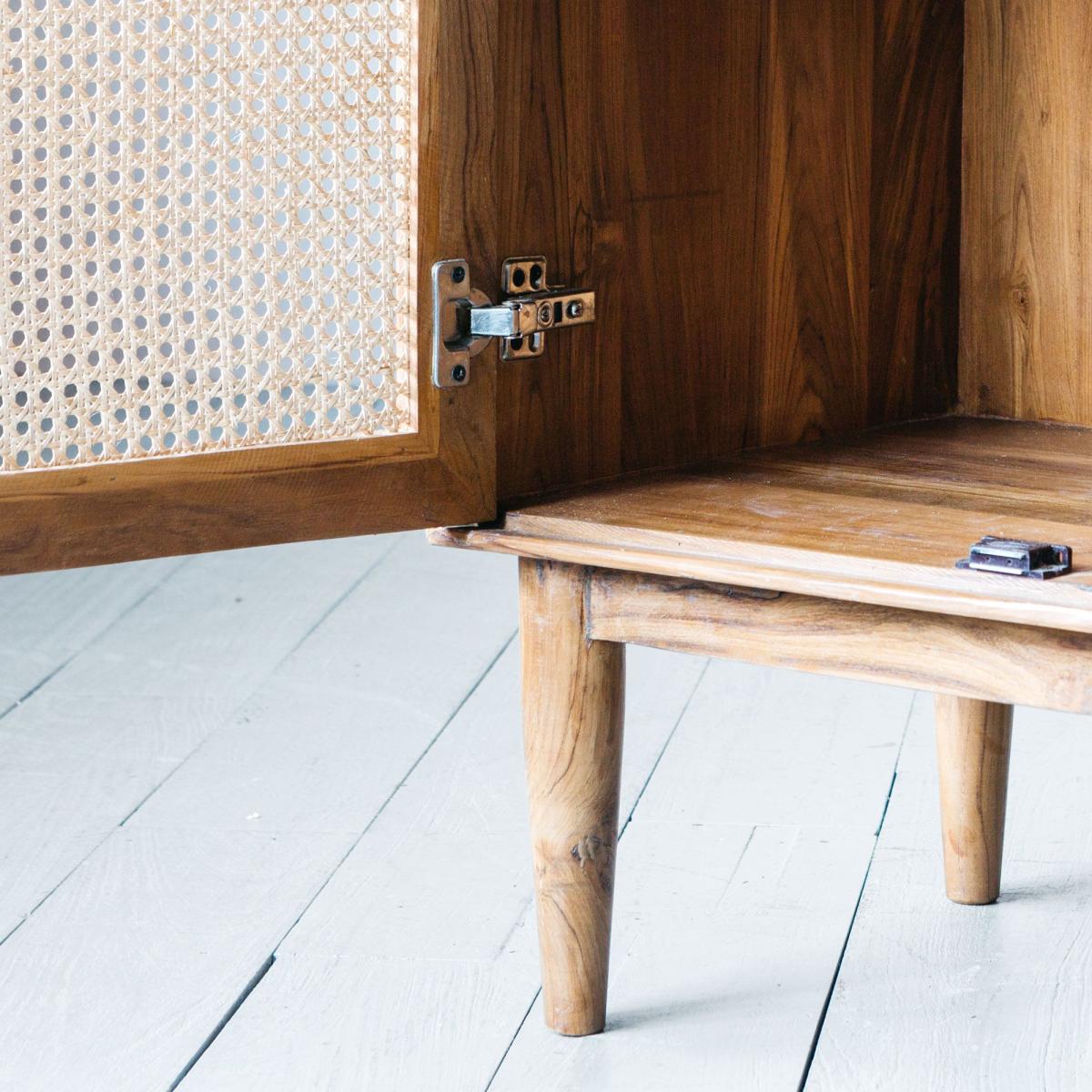 In a gloriously warm teak wood this seventies-inspired sideboard features finely tapered legs, cool cane fronted cabinet door and sleek iron handles with an aged finish. Inside, four small drawers and three shelves offer plenty of storage for your kitchen essentials or the retro cocktail collection of your dreams.