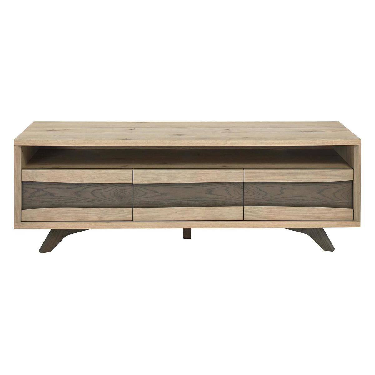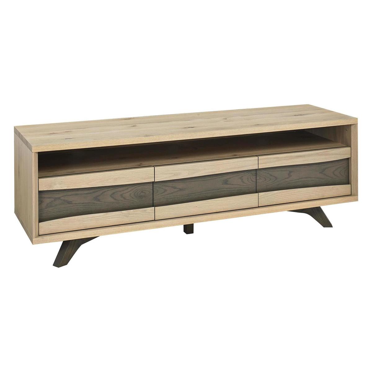 Providing ample storage space with a narrow shelf and three drawers, this striking TV stand is crafted from weathered oak with wavy edges, natural grain and angled legs.