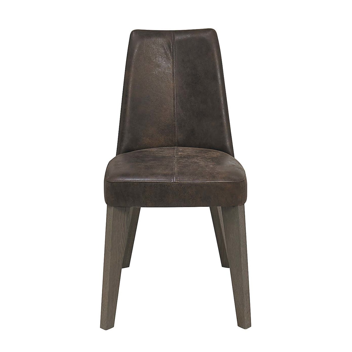 Upholstered with distressed brown faux leather, this pair of dining chairs boasts dark oak tapered legs and visible stitch detail.