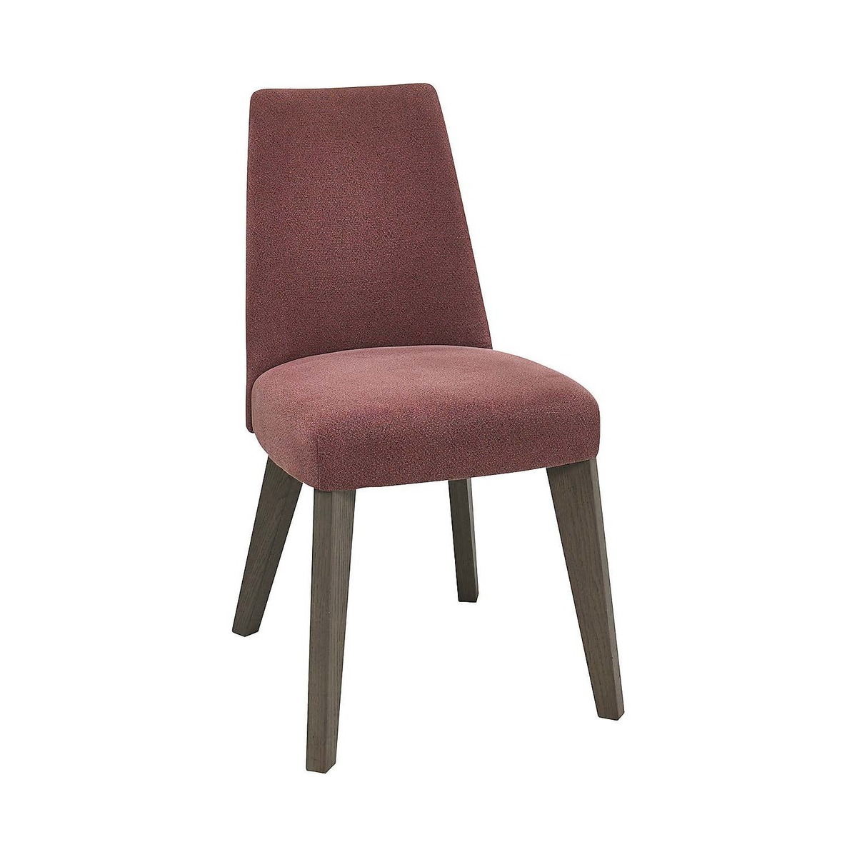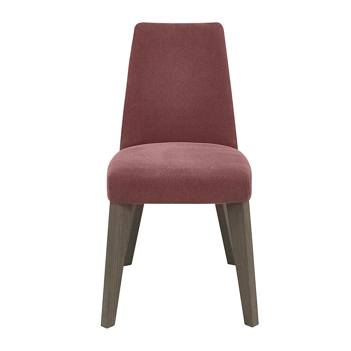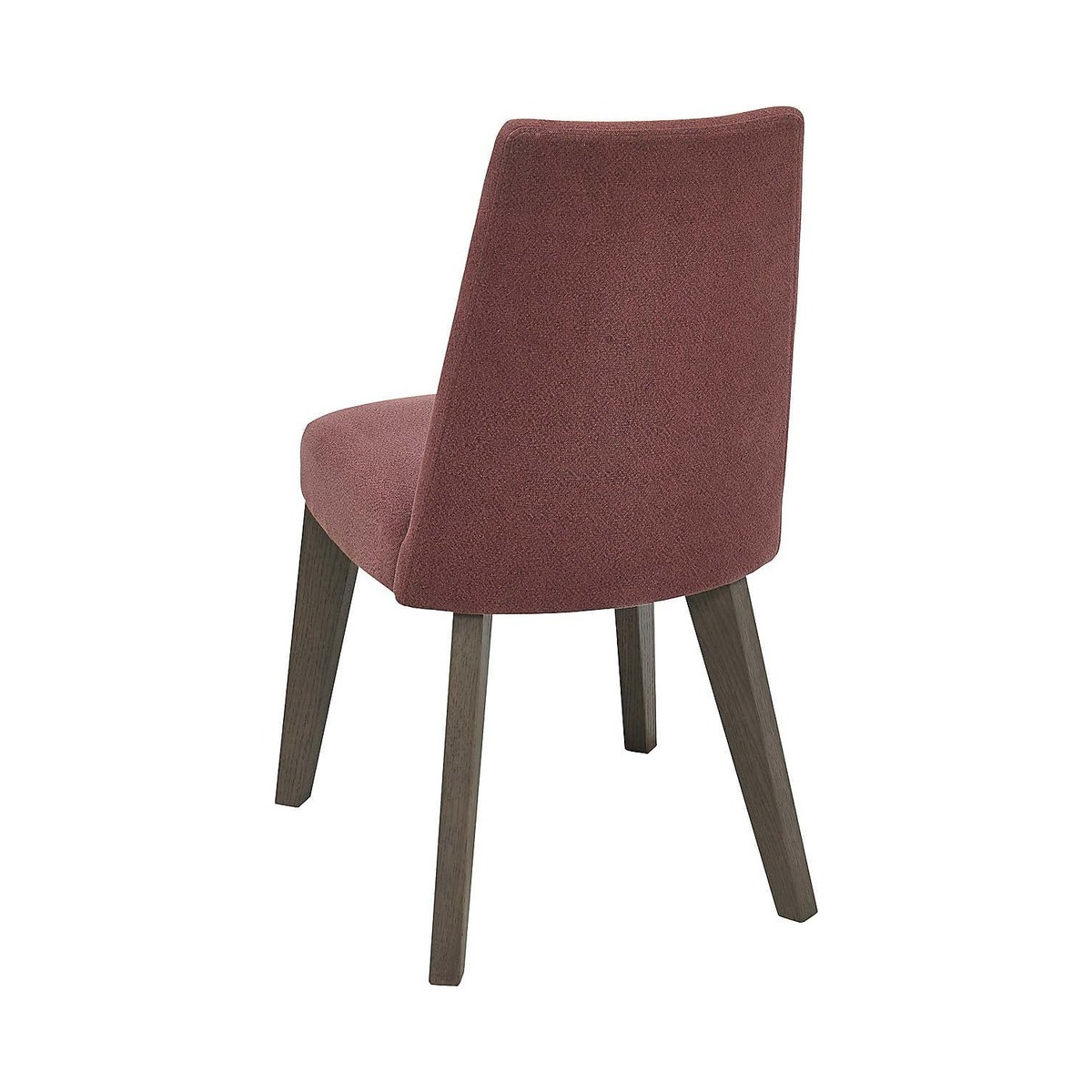 Finished in a warm stonewashed mulberry fabric, this pair of dining chairs boast dark weathered oak legs with natural grain detail.