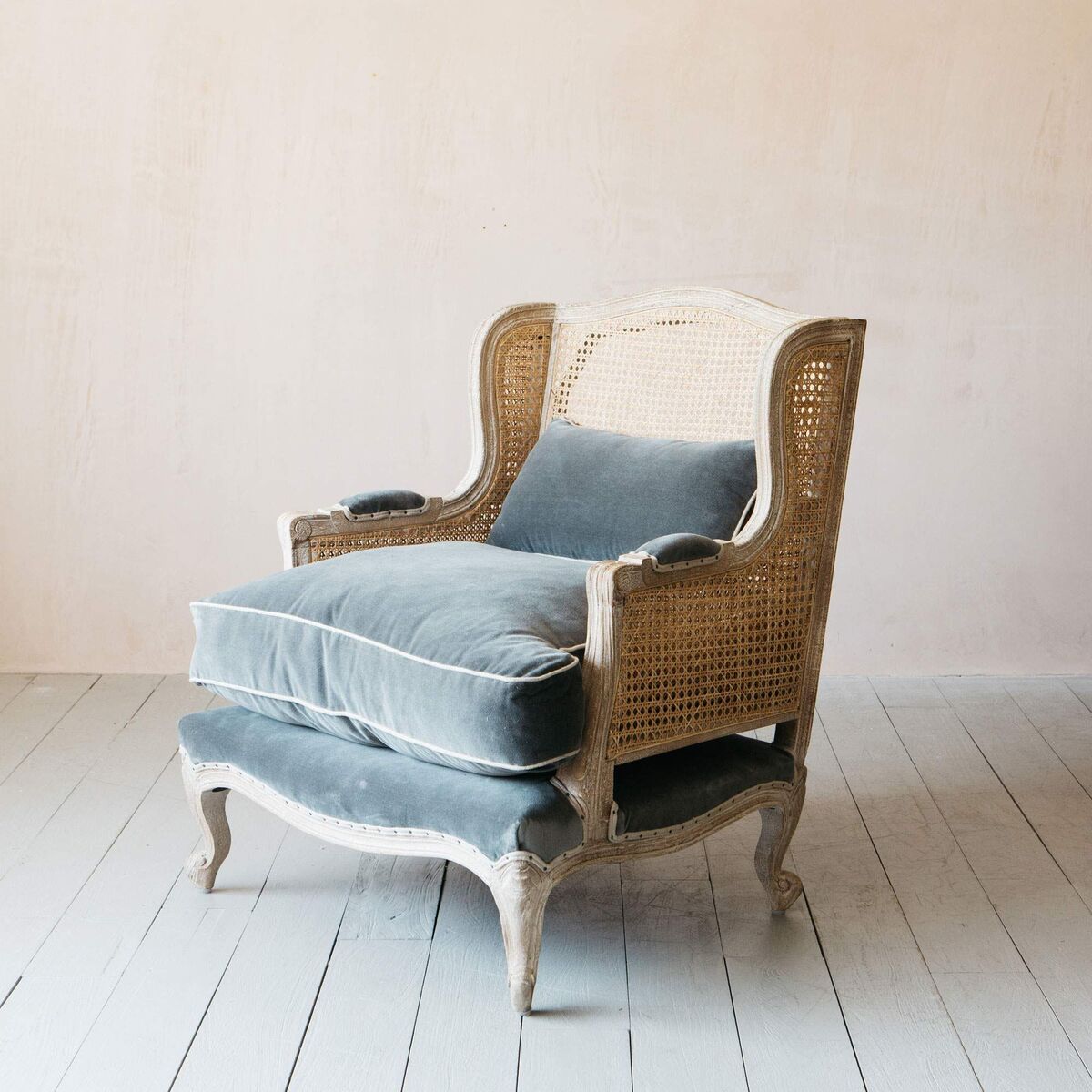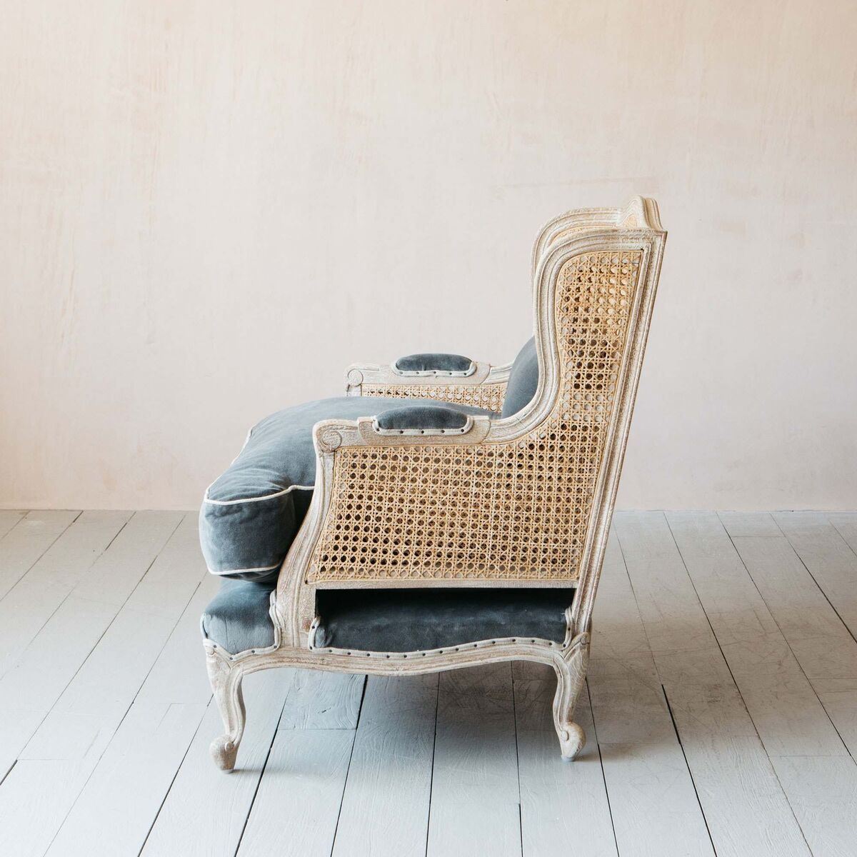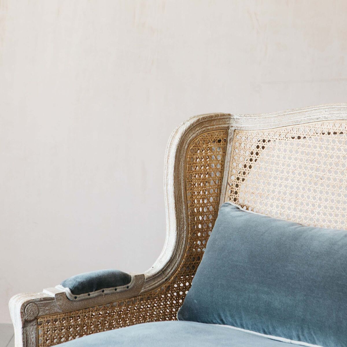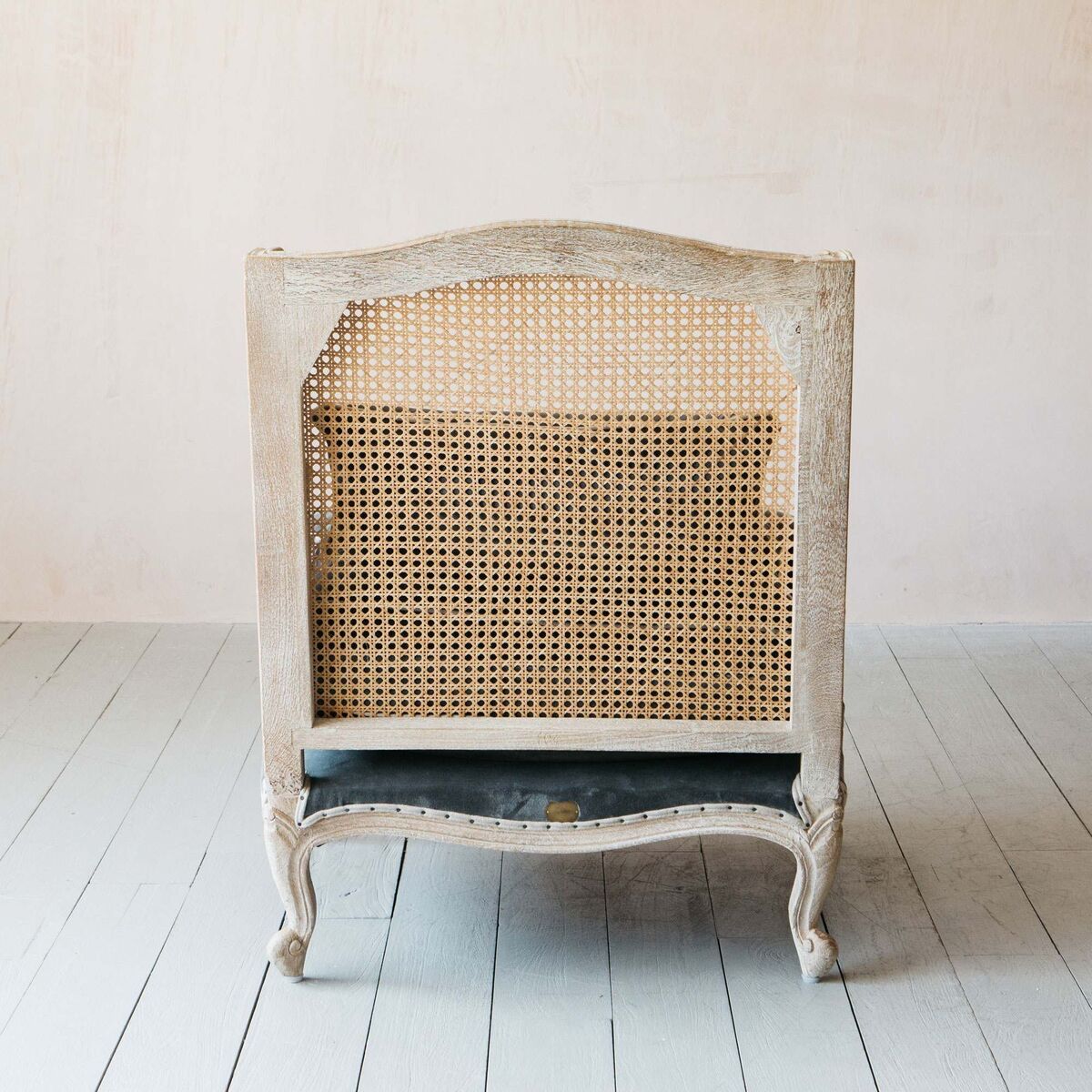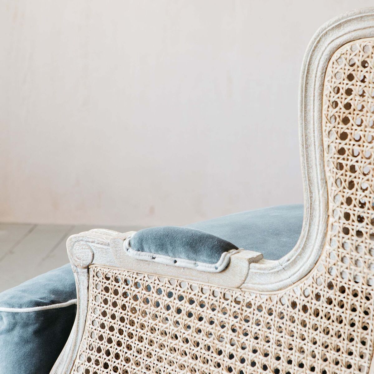 Our Caden Cane Armchair in Grey Velvet offers French antique style with a sumptuous twist. Upholstered in deep grey velvet with a natural piping that complements the intricately carved wooden legs and handwoven cane detailing. H100 x W86 x D68cm. Seat height: 51cm. Wooden frame with handwoven cane back and sides. Grey cotton velvet upholstery with piping detail in a French antique style. Comes with a plump seat cushion and back cushion. Due to the handmade nature, colour and pattern of the cane may vary and the colour of the velvet may vary dependent on lighting.