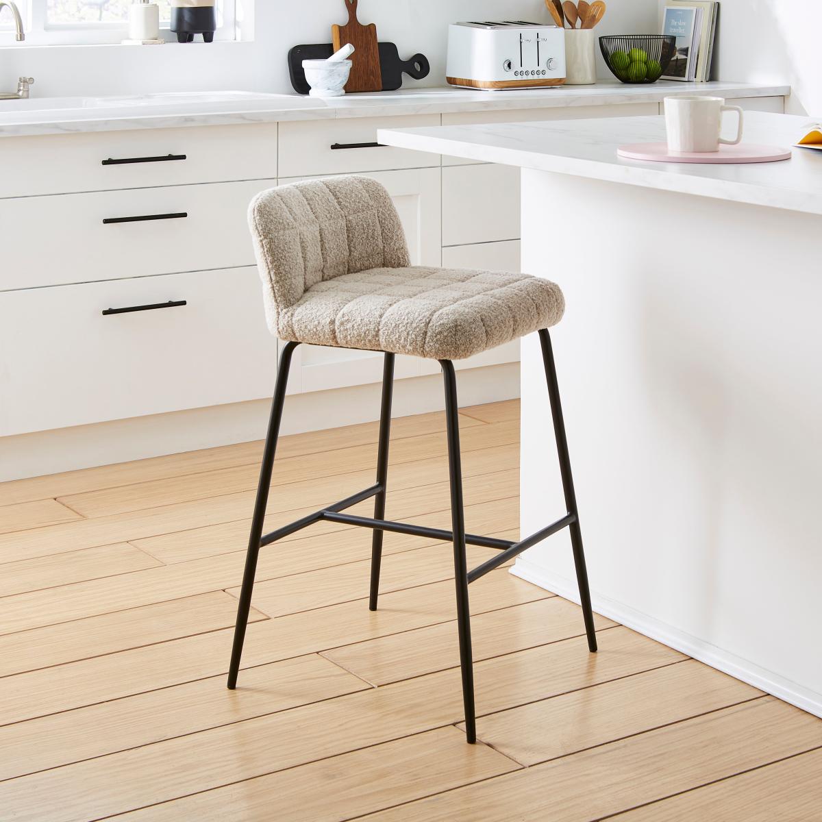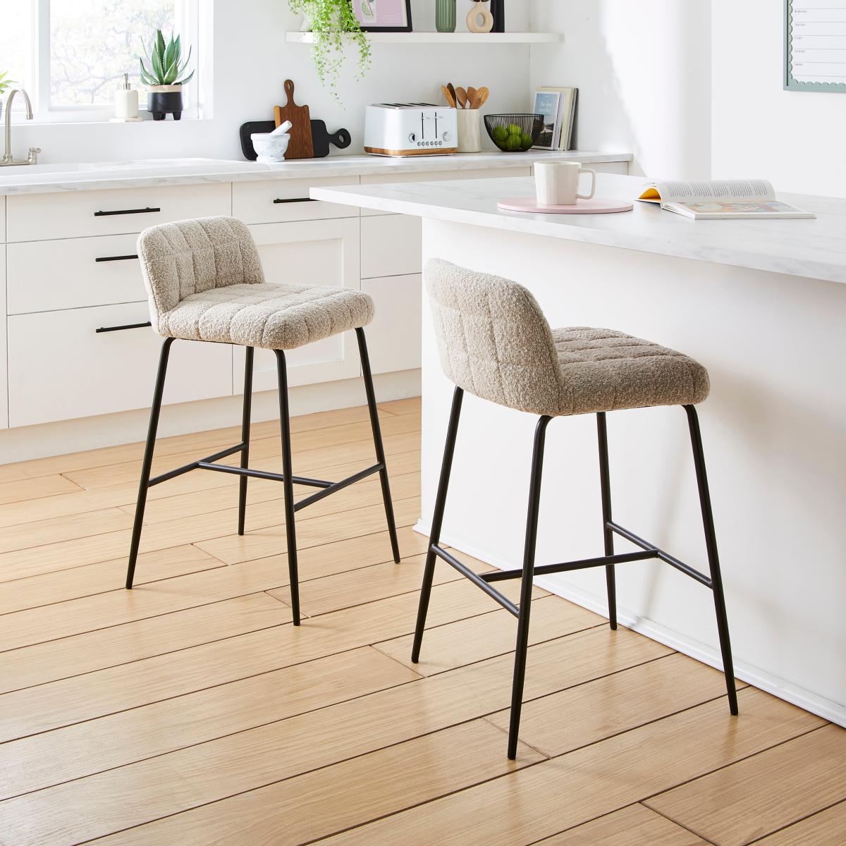 I’m a fan of these Caden stools for their soft boucle upholstery and sleek black legs - they bring just the right amount of texture without overwhelming a space. The neutral mushroom tone makes them versatile in Scandi-inspired kitchens, contemporary breakfast bars or even pared-back industrial schemes. Styling tip: layer a small sheepskin or knitted seat pad over the cushion for extra comfort and a touch of contrast, and position under a marble or light-wood island to let the curves of the stool really pop. They also work well in pairs or threes, so think about staggering heights of pendant lights above to balance the composition.