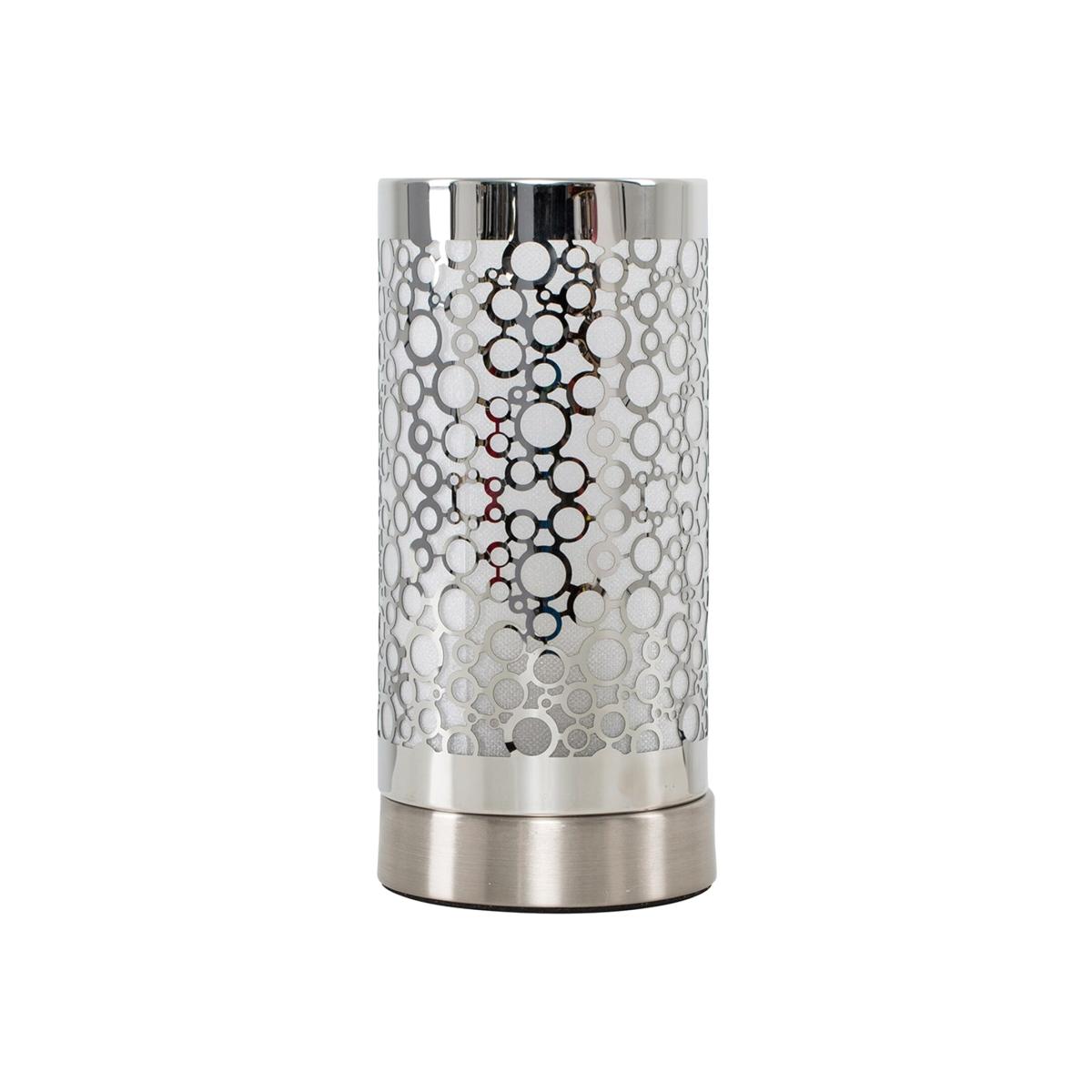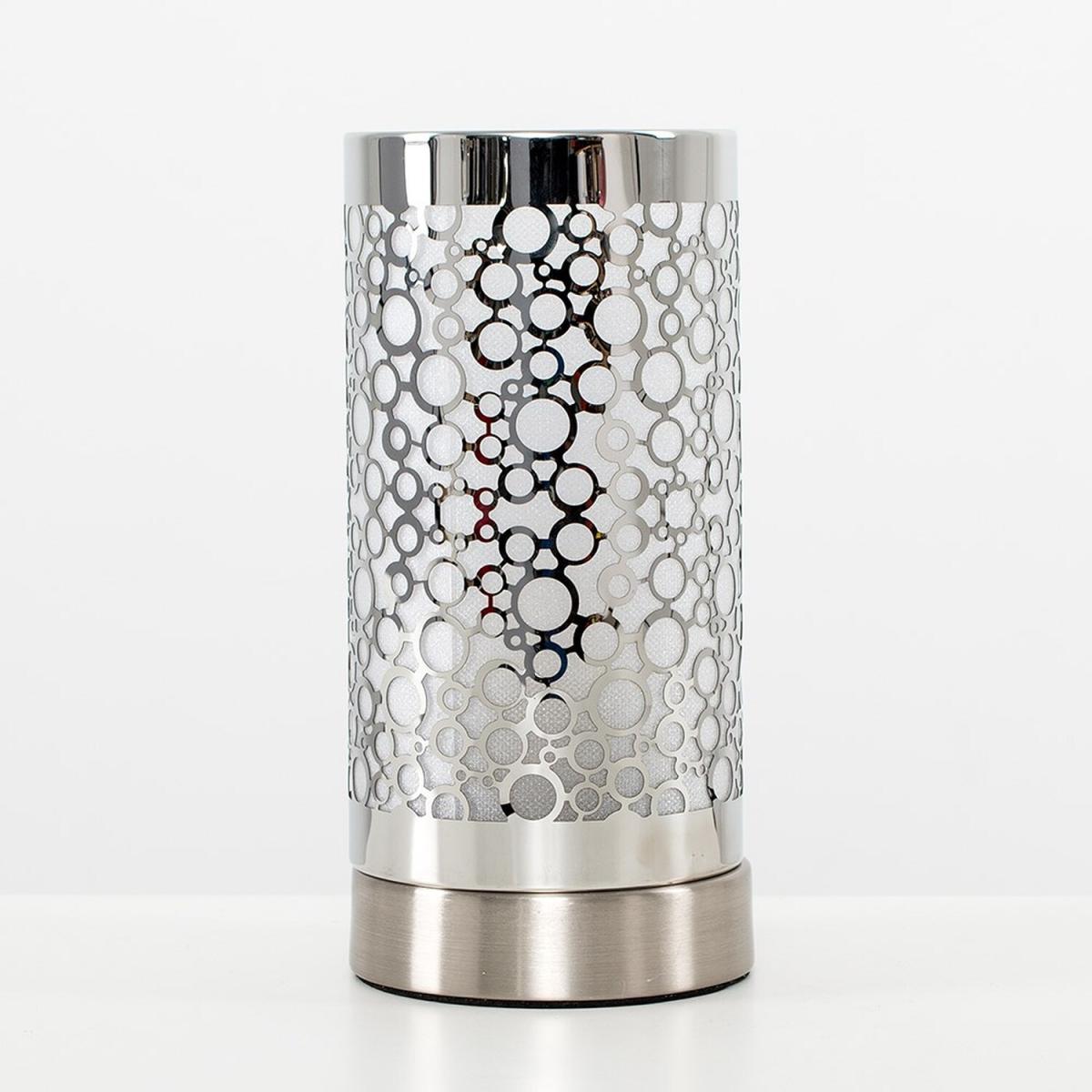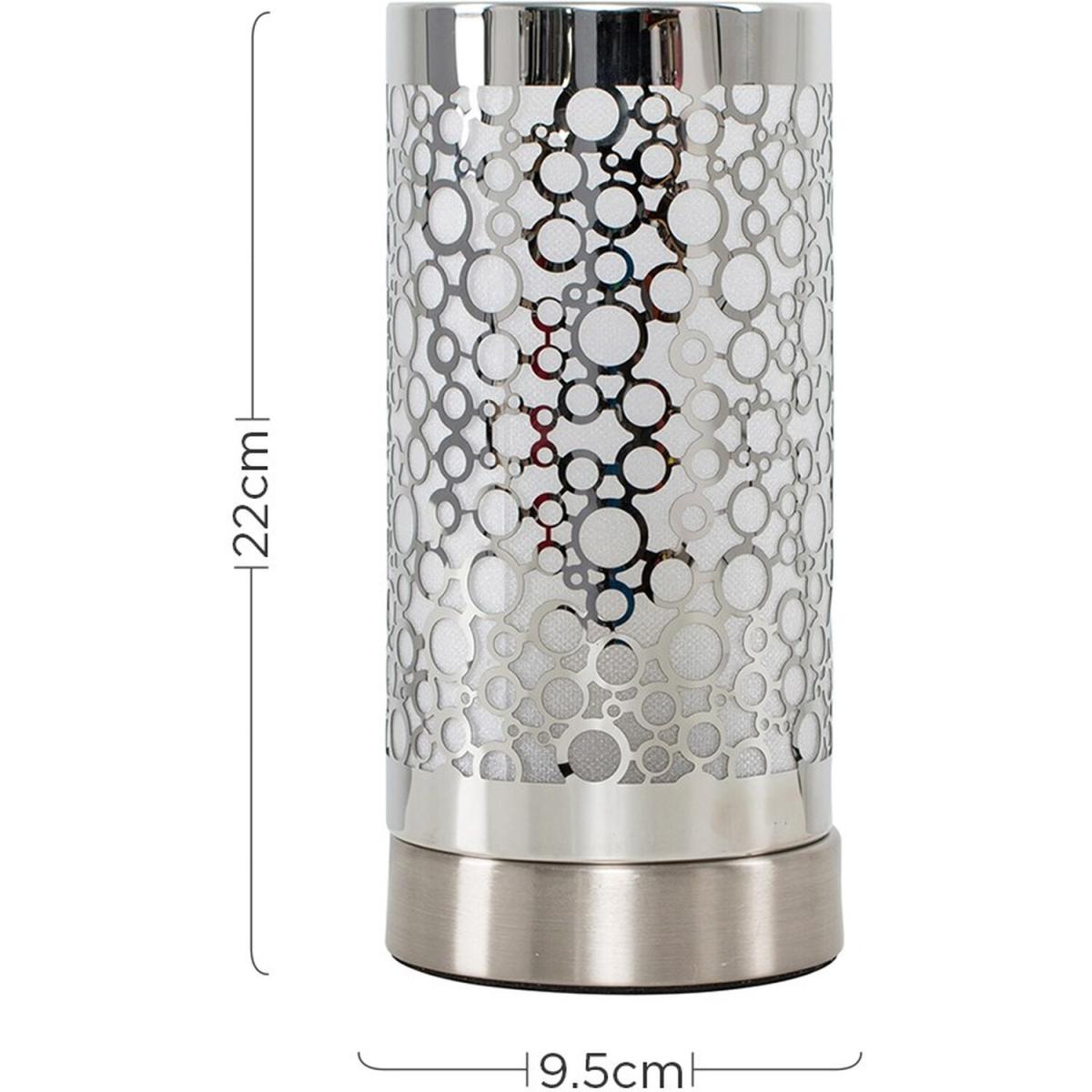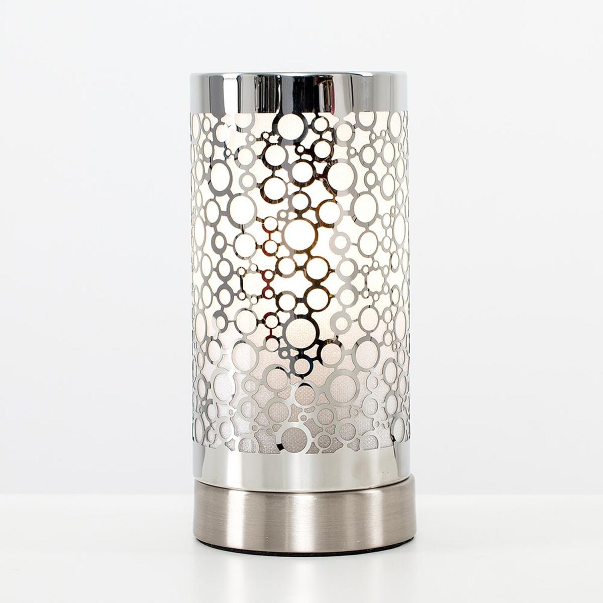 Modern cylinder touch table lamp in a brushed chrome metal finish. Complete with a chain design shade in a silver chrome finish and features a diffuser which allows the light to be dispersed throughout the room evenly. This contemporary light is a great way to update any living area. Simply touch the metal base to turn it on. The light can be set to 4 stages off, a low level light for mood lighting, a medium level light for general lighting and a high level light which is the brightest setting to create an intense pool of light. Ideal for lounges, bedrooms, hallways and other living areas. Please Note This lamp requires dimmable bulbs. Not suitable for standard LED or energy saving bulbs.