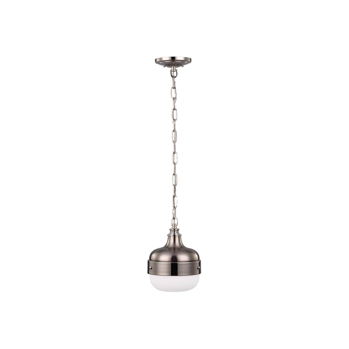 This mini ceiling pendant is finished in polished nickel and brushed steel, featuring a riveted centre band, as well as a vented top and square-linked chains on the pendant that adds rich, visual interest yet doesn't distract from the clean lines in the overall silhouette. Also available in this range Pendant and Flush Mount.