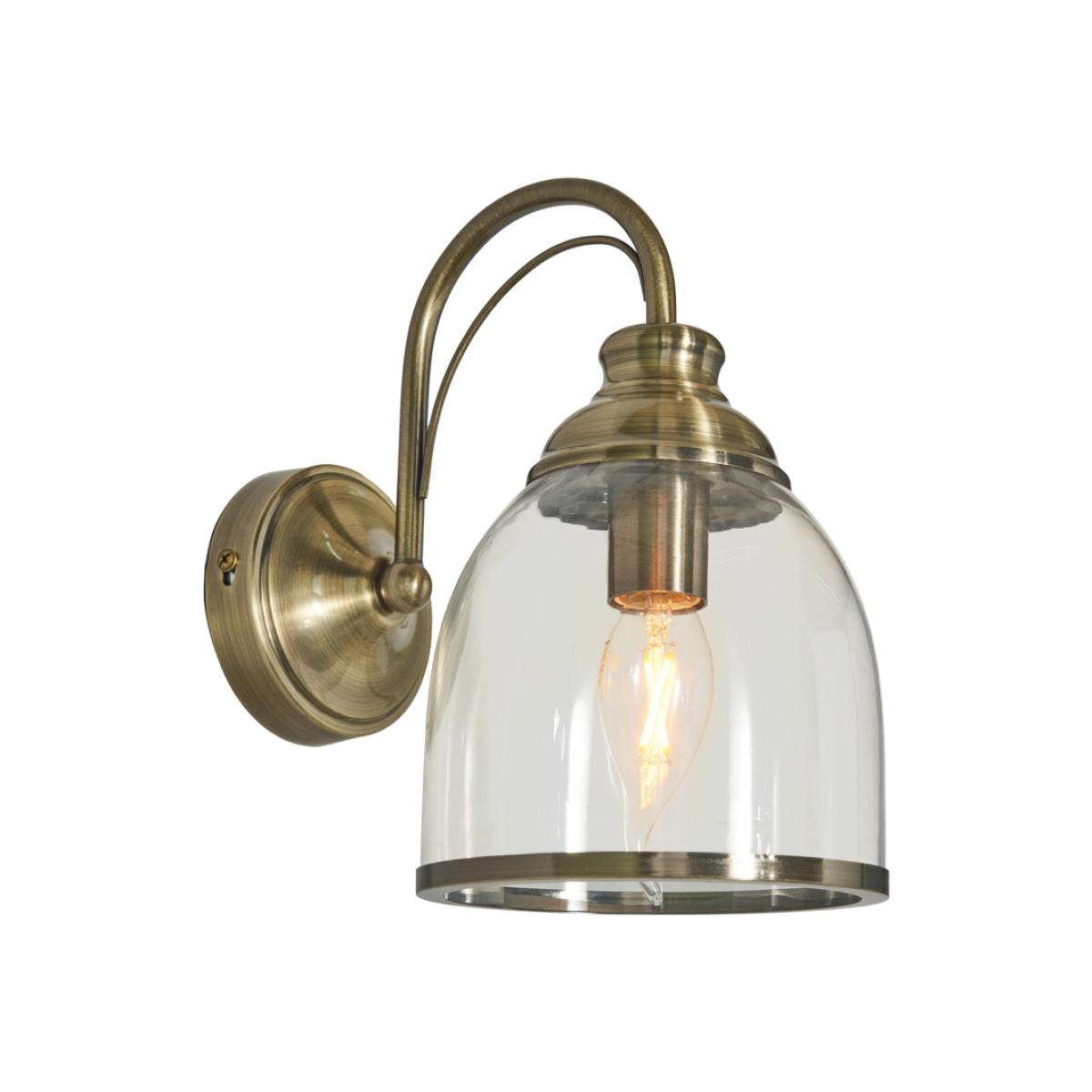Elevate your space with the Cadence 1 Light Wall Lamp. Its timeless design and antique brass finish exude elegance, casting a warm and inviting glow. Crafted with attention to detail, the glass shade adds a touch of sophistication to any room, looking ideal when paired with a separately sold vintage filament light bulb. The antique brass finish of the Cadence Wall Lamp brings a classic touch to your interior decor; Emitting a soft and warm glow, this lamp creates a cosy atmosphere; Showcases attention to detail and quality with a curved design.