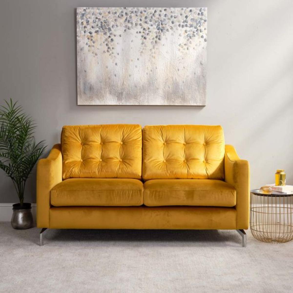 The Cadiz 2 Seat Sofa in vibrant Saffron velvet will create a wonderlful piece in any setting. Like all of the Cadiz range, it has button detailing on the back cushion, and sleek modern chrome legs, with a fabulous combination of traditional upholstery with a modern twist. The Cadiz collection is also available in more stunning shades of velvet, from a gorgeous Tangier orange to a striking Ocean velvet. Dimensions: W170cm x H90cm x D93cm, Seat Height 47cm Velvet Upolstery Curved arm design Chrome legs. Simple self assembly