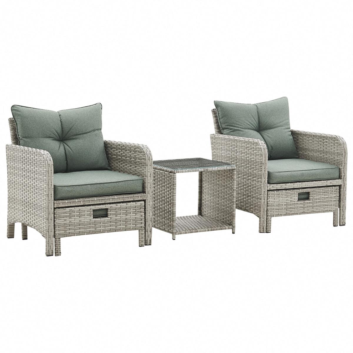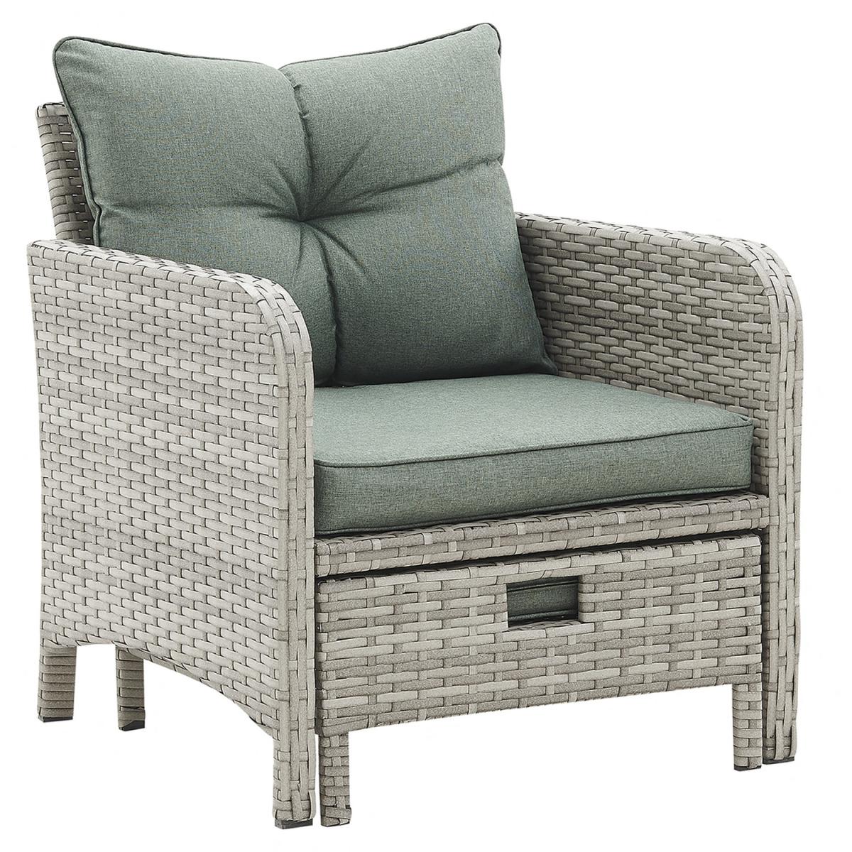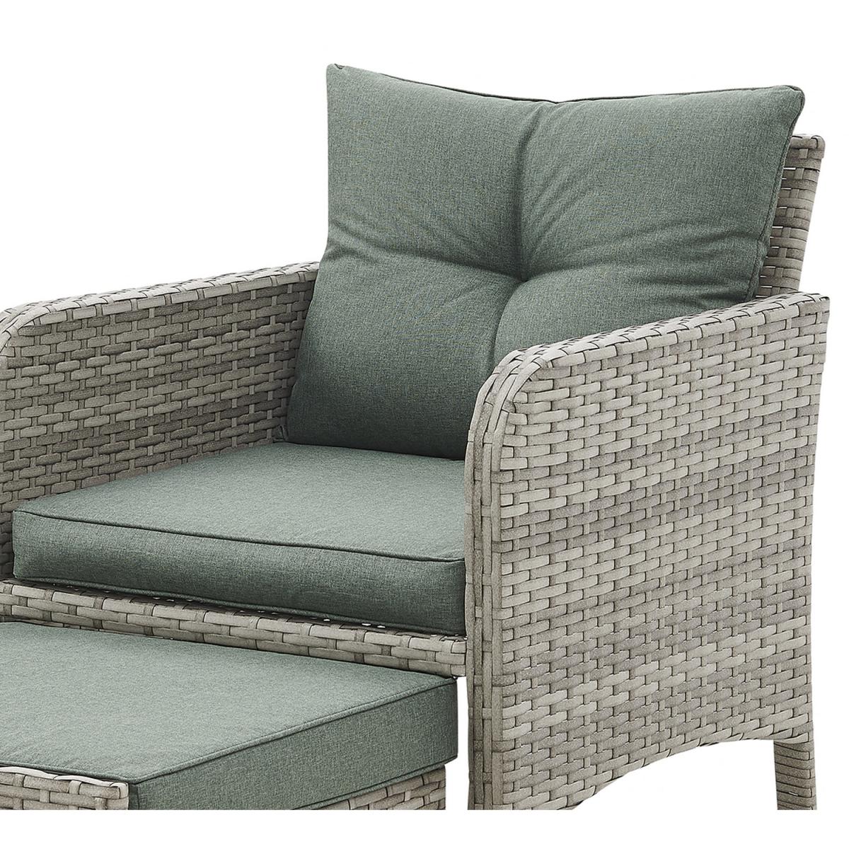 Introducing Cadiz, a two-armchair garden set, featuring 2 ottoman footstools which can be tucked away under each chair, and a glass-topped side table, with green seat, backrest and footstool cushions included. More and more of us are spending our summer holidays in the garden, maximising our personal space and saving money on pricey international travel! Any modern home can benefit from our collection of patio furniture, which features a chic rattan style aesthetic. Escape to your private refuge in your garden or patio to extend the length of the summer. This set does not come with a cover - we recommend you purchase a waterproof cover to preserve your garden set when not in use. This garden set is durable and for outdoor use all year round in mild to warm weather. Although the cushions are weather-proof, we do not advise leaving them out in adverse weather conditions for long periods of time. We recommend the whole set be moved indoor over the winter. While the cushions have zips, we advise against removing the covers because they are challenging to put back on. If necessary, apply upholstery shampoo and store cushions indoors while not in use.