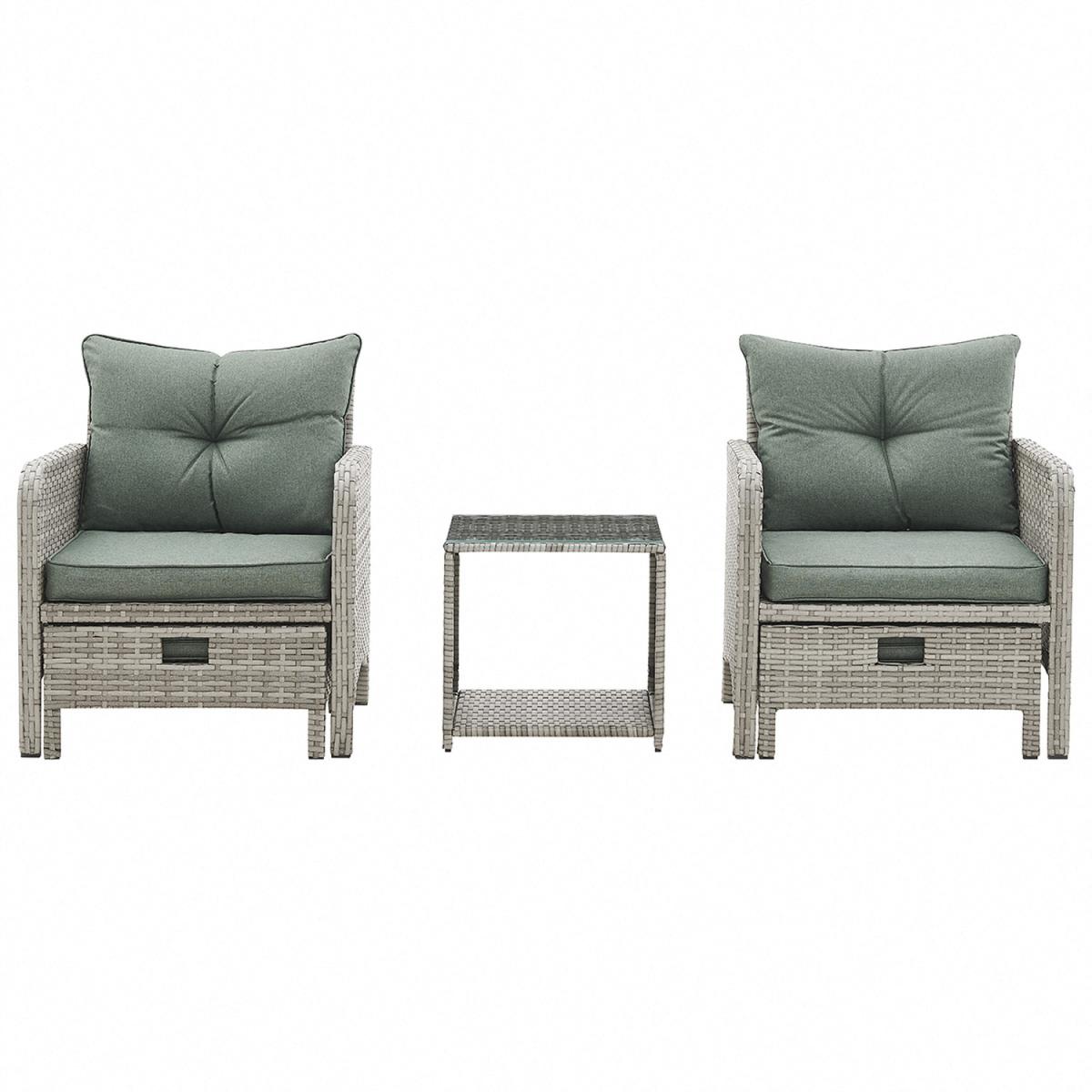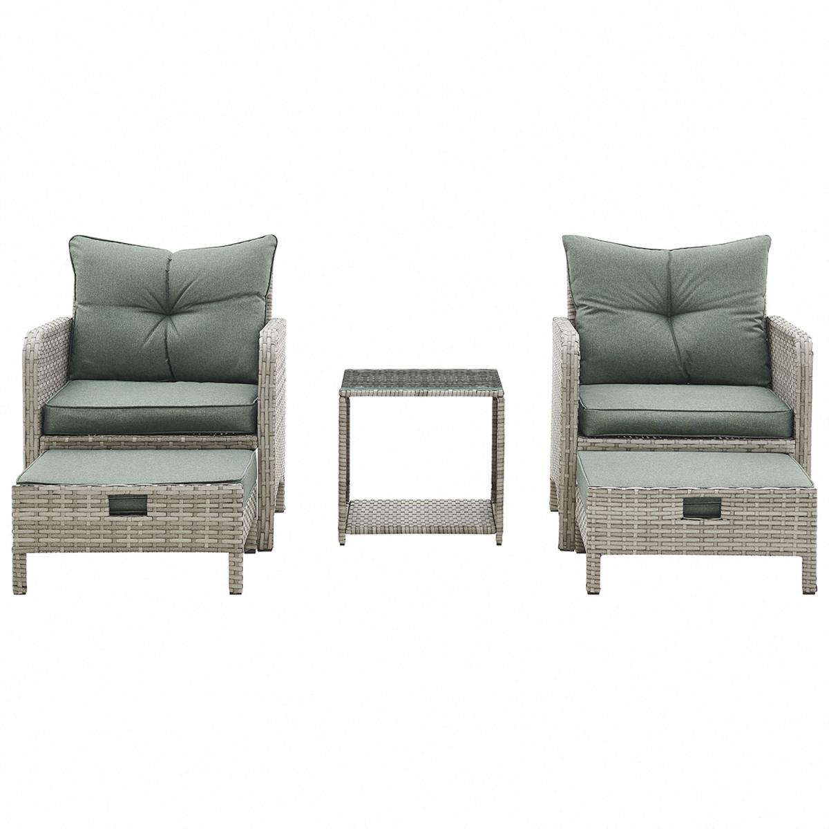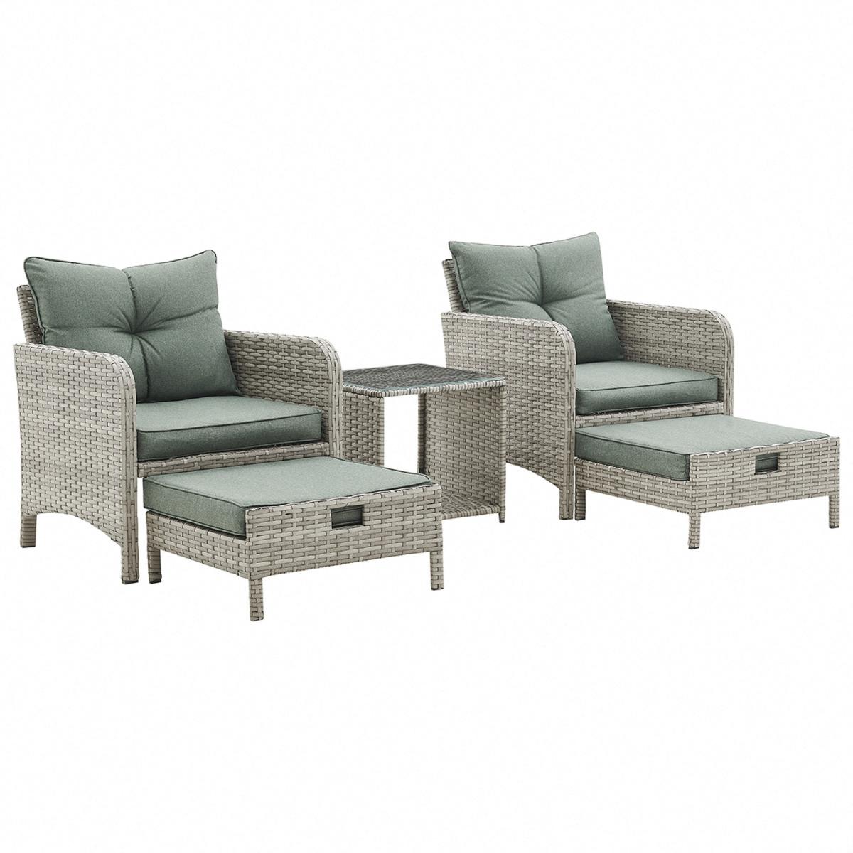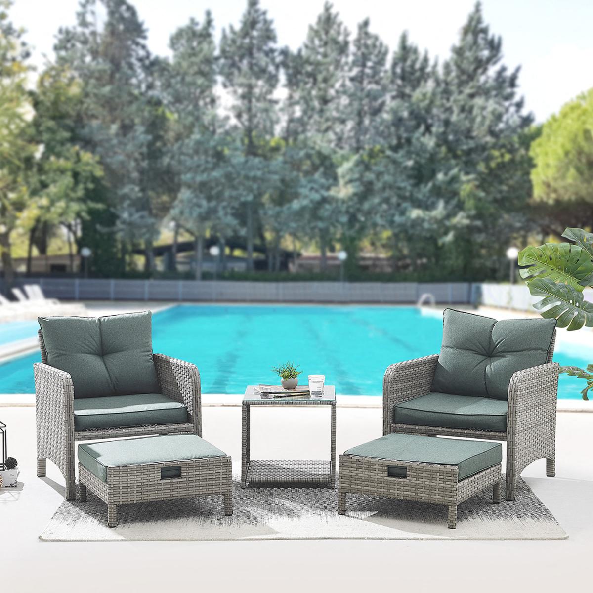 Introducing Cadiz, a two-armchair garden set, featuring 2 ottoman footstools which can be tucked away under each chair, and a glass-topped side table, with green seat, backrest and footstool cushions included. More and more of us are spending our summer holidays in the garden, maximising our personal space and saving money on pricey international travel! Any modern home can benefit from our collection of patio furniture, which features a chic rattan style aesthetic. Escape to your private refuge in your garden or patio to extend the length of the summer. This set does not come with a cover - we recommend you purchase a waterproof cover to preserve your garden set when not in use. This garden set is durable and for outdoor use all year round in mild to warm weather. Although the cushions are weather-proof, we do not advise leaving them out in adverse weather conditions for long periods of time. We recommend the whole set be moved indoor over the winter. While the cushions have zips, we advise against removing the covers because they are challenging to put back on. If necessary, apply upholstery shampoo and store cushions indoors while not in use.