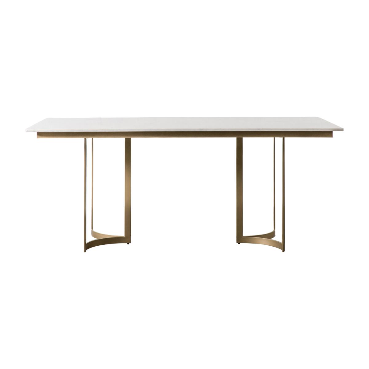 Dine in style with the Cadotte Dining Table, a sleek rectangle shape with clean white marble top. Suitable for 6 seats and available in black or gold metal colour options, this table has a unique and exceptional design feature where the legs curve inwards, preventing limbs from tanging with the metal base when dining and creating a captivating design. Includes: 1 x table top, 2 x legs & fixtures.