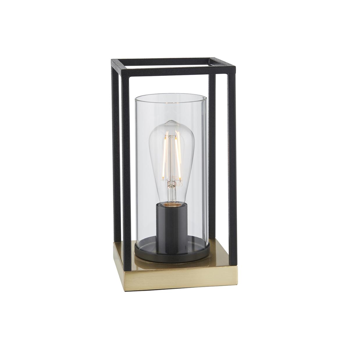 Designed to be both functional and stylish, this table lamp features a clear glass shade surrounded by a sleek black frame and finished with a satin brass base. With its minimalist yet eye-catching design.