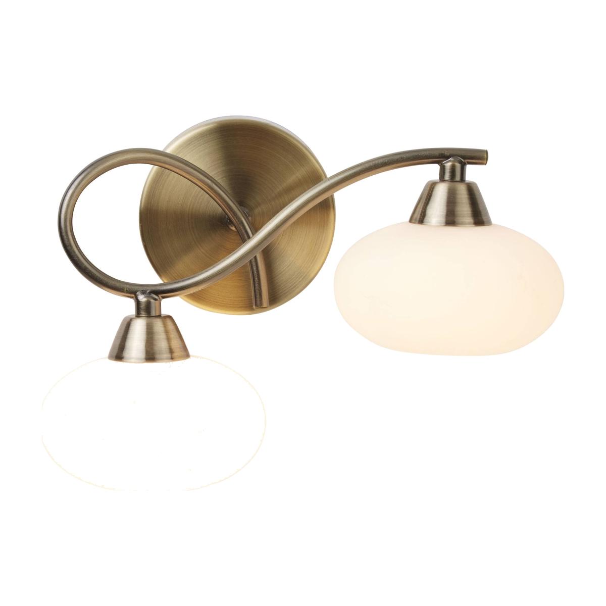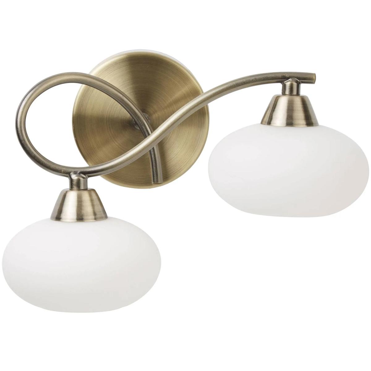Traditional wall light boasting an antique brass finish.. A beautiful addition to your home, this wall light is part of the Caen range from Pagazzi Lighting. Boasting an antique brass finish, the light features and intertwined arm holding 2 oval-shaped white shades. It is perfect for use in hallways, lounges and bedrooms.