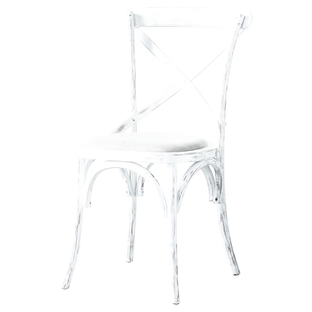 A pack of 2 understated cross back chairs in a distressed white wood finish with canvas seat pads. Ideal for casual dining creating a relaxed French café feel in the home.