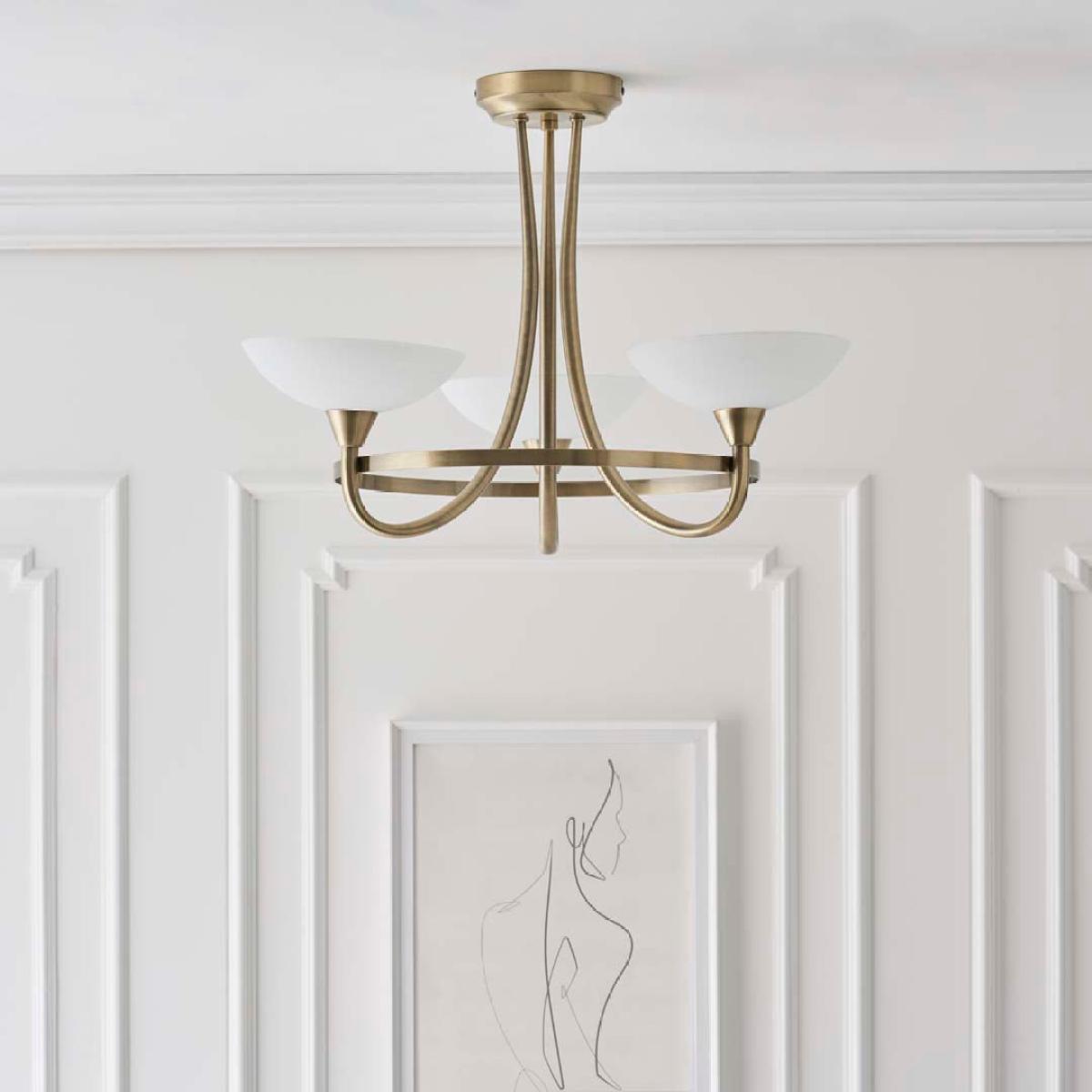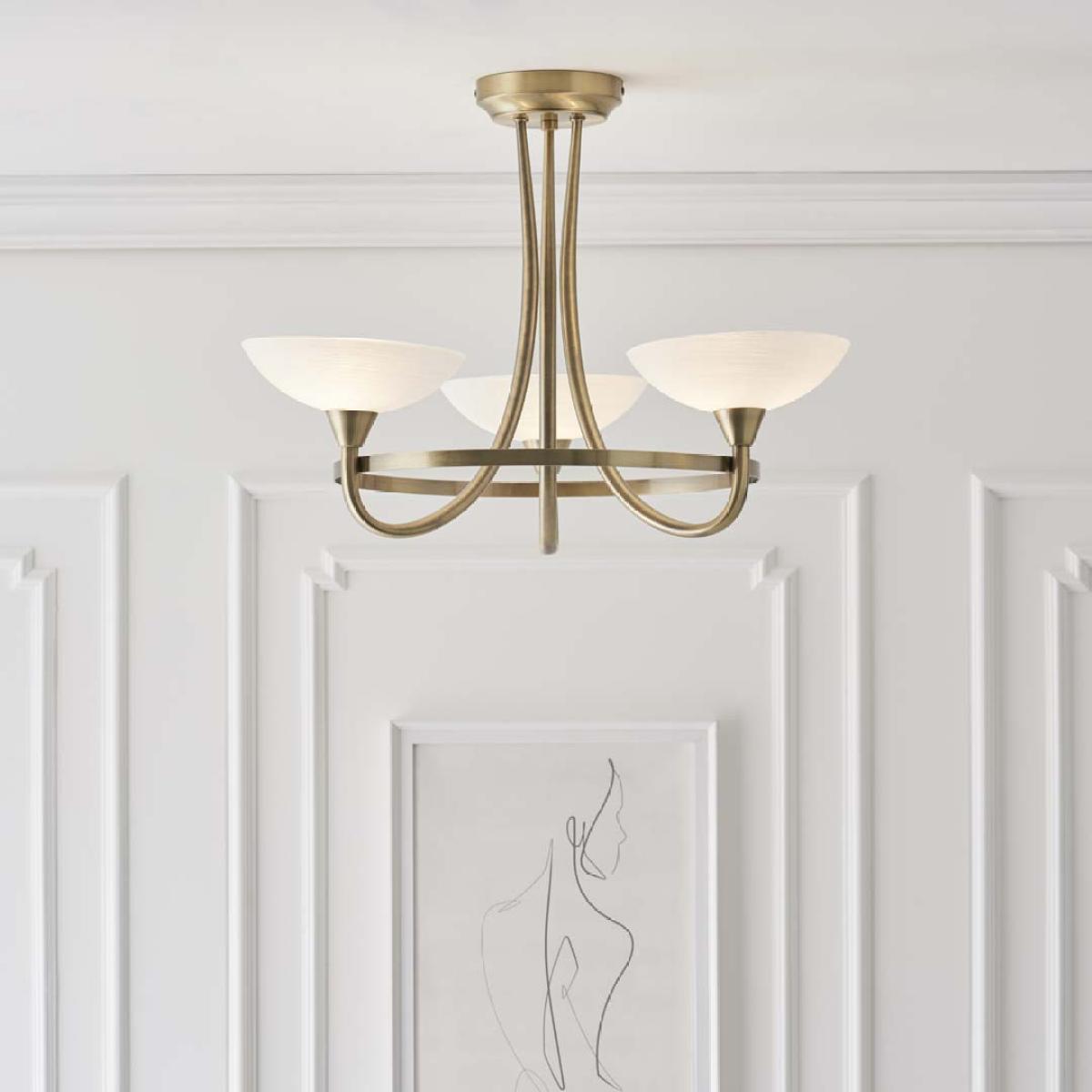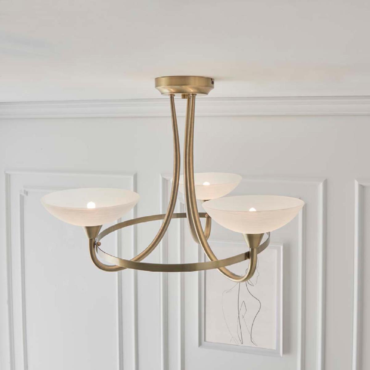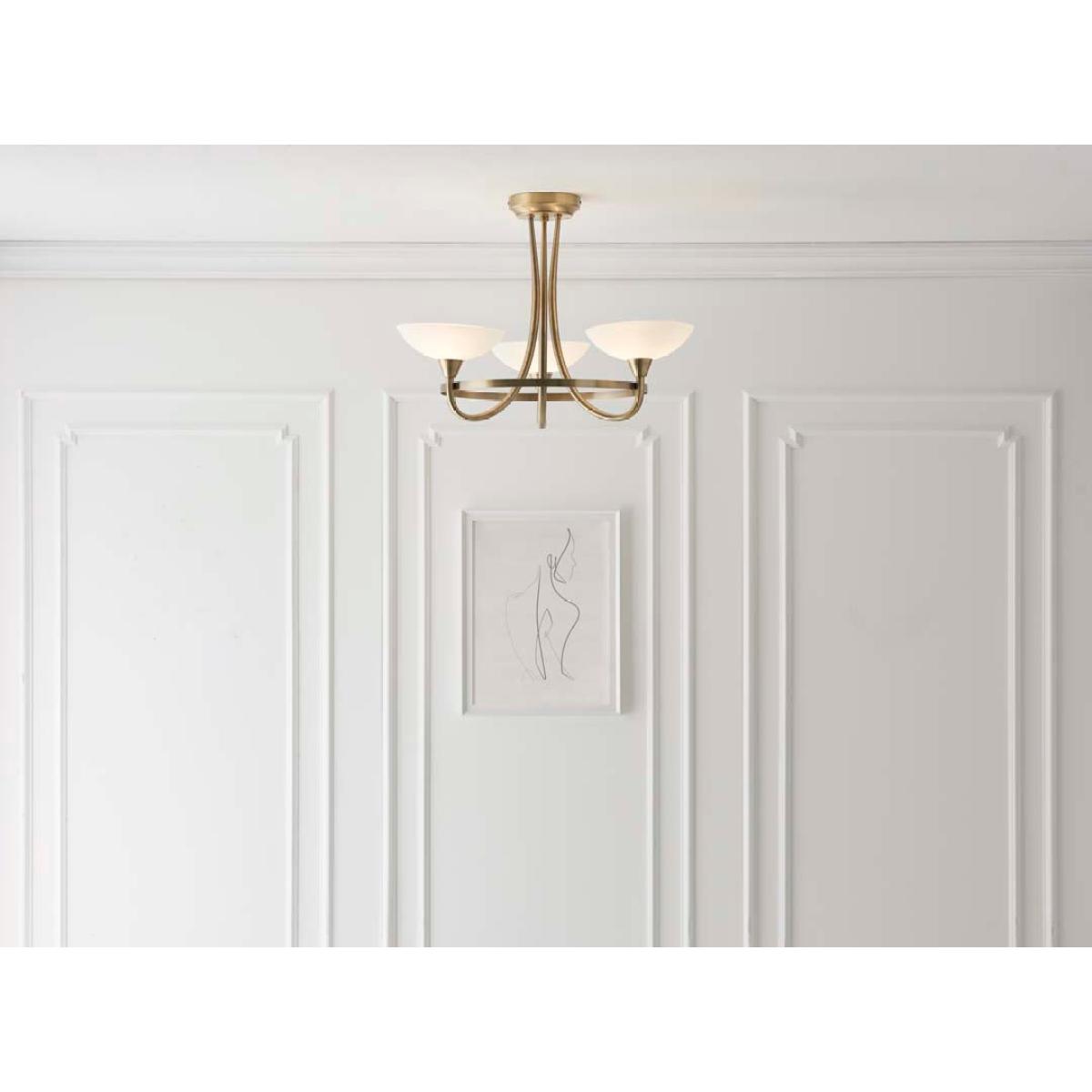 Modern semi flush ceiling light boasting an antique brass finish. The Cagney 3 Light Ceiling Light is a chic fitting from Endon. The styling of this semi flush piece makes it suitable for homes boasting both traditional or contemporary home decor. Finished in antique brass throughout, the curved frame features three arms which support delicate opal glass uplighter shades. We recommend using our 3w LED G9 capsule bulbs which are a great replacement for standard halogen bulbs. Modern semi flush ceiling light boasting an antique brass finish. The Cagney 3 Light Ceiling Light is a chic fitting from Endon. The styling of this semi flush piece makes it suitable for homes boasting both traditional or contemporary home decor. Finished in antique brass throughout, the curved frame features three arms which support delicate opal glass uplighter shades. We recommend using our 3w LED G9 capsule bulbs which are a great replacement for standard halogen bulbs.