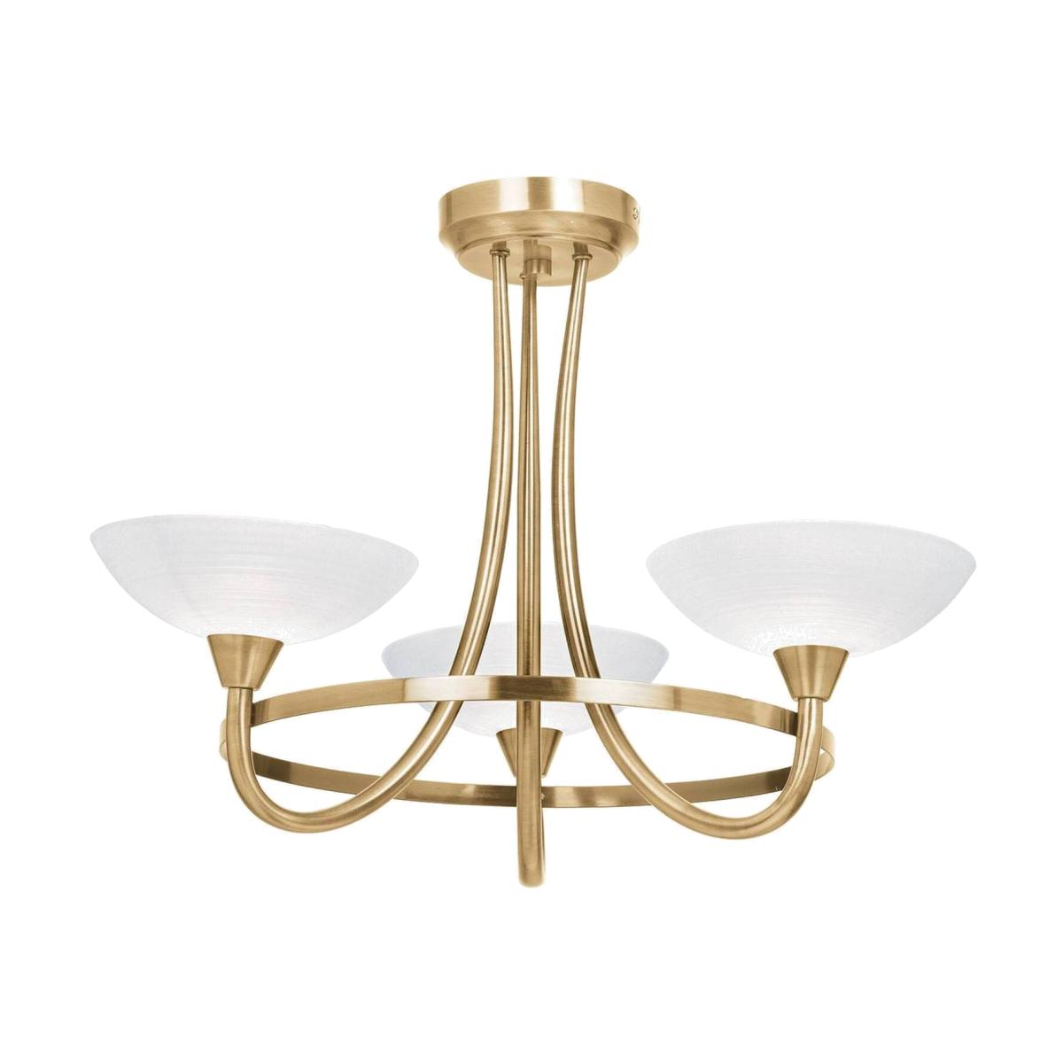 The 3 light semi flush is finished in antique brass effect with white painted glass shades with faint line detailing. suitable for use with LED lamps and dimmable matching 5 light semi flush and wall light options and satin chrome finish also available.