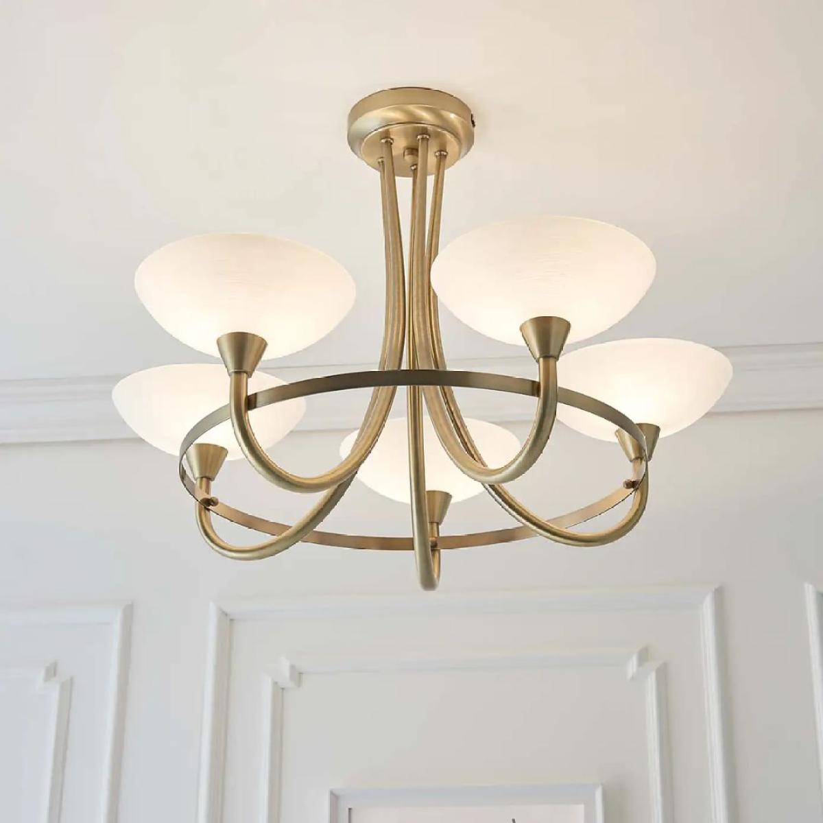 Modern semi flush ceiling light boasting an antique brass finish. The Cagney 5 Light Ceiling Light is a chic fitting from Endon. The styling of this semi flush piece makes it suitable for homes boasting both traditional or contemporary home decor. Finished in antique brass throughout, the curved frame features five arms which support delicate opal glass uplighter shades. We recommend using our 3w LED G9 capsule bulbs which are a great replacement for standard halogen bulbs. Modern semi flush ceiling light boasting an antique brass finish. The Cagney 5 Light Ceiling Light is a chic fitting from Endon. The styling of this semi flush piece makes it suitable for homes boasting both traditional or contemporary home decor. Finished in antique brass throughout, the curved frame features five arms which support delicate opal glass uplighter shades. We recommend using our 3w LED G9 capsule bulbs which are a great replacement for standard halogen bulbs.