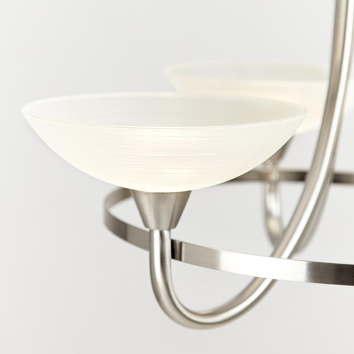 The 5 light semi flush is finished in satin chrome effect with white painted glass shades with faint line detailing. suitable for use with LED lamps and dimmable matching 3 light semi flush and wall light options and antique brass finish also available.