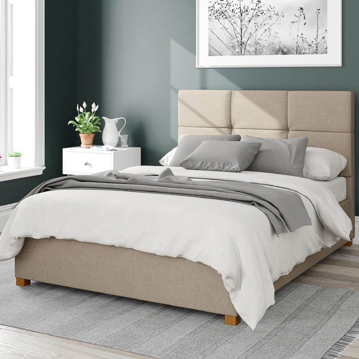 * Large storage area with fabric dust protection sheet* Hands free access to storage (mattresses up to 60kg)* Contemporary geometric headboard design* Eire linen fabric* Hand upholstered with deep padding* Solid hardwood feet* Manufactured in the UK* Different colour options available As you drift off into slumber, you deserve to be comfortable, so why not invest in this durable Eire Linen bed frame. Eire Linen has a unique texture that will look great in your bedroom space. The Caine Fabric Ottoman Bed is the perfect combination of modern design and practicality. The deep padded headboard boasts a sleek and clean aesthetic, while the stylish solid hard wood feet add a touch of elegance. With its gas lift pistons, the ottoman bed provides ample storage space that can be easily accessed with minimal effort. Once the mechanism is open, it will hold in place, allowing for hands-free access to the spacious storage area. For your added convenience, the bed comes complete with a dust sheet to keep the storage area clean. It's worth noting that the storage area is not a boarded base. To provide you with the ultimate comfort and support, the bed features quality spring slats, ensuring you have a good night's sleep. And with a mechanism capable of lifting a mattress weighing up to 60kg, you can rest easy knowing you're getting the best in practicality and durability. The bed is supplied flat pack, and assembly is made easier with two people. It takes just 1-2 hours to assemble and meets all UK safety standards. We've also gone above and beyond by conducting non-mandatory structural testing, giving you peace of mind knowing your new bed is built to last.