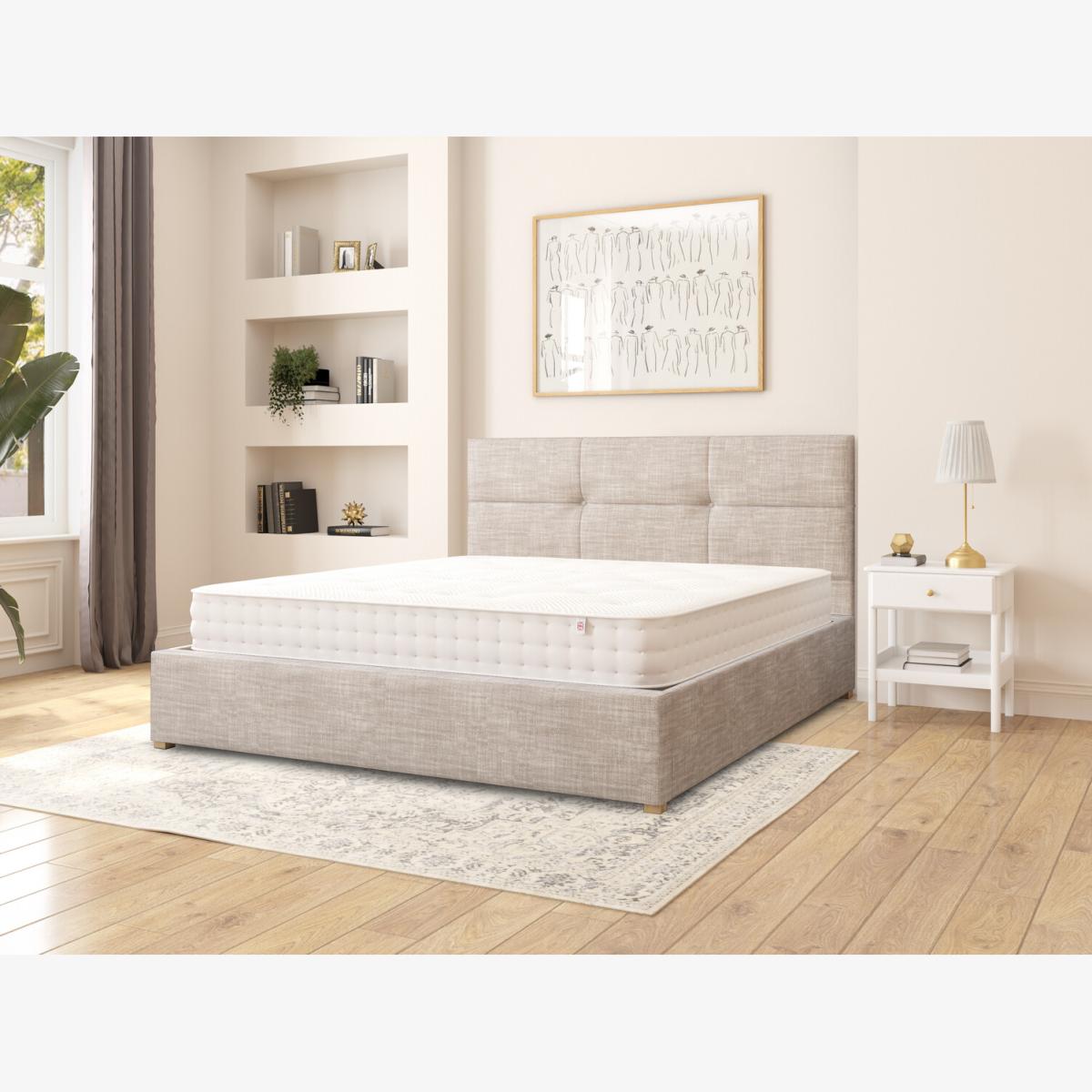 Quality upholstered ottoman storage bed, hand crafted in the UK. Each headboard is constructed with deep foam padding perfect for sitting up in bed and reading. We believe quality has no short cuts, meaning all our designs are hand upholstered by our skilled craftsmen. Our UK ottoman design features chunky upholstered panels, which means it is built to last. Quality sprung slats improve comfort and mattress lifespan. The easy lift ottoman mechanism is supported with quality gas pistons, enabling the storage to be accessed with minimal effort. Once the ottoman is elevated it will hold position, allowing hands free access to storage. Our ottomans offer the perfect storage solutions for rooms with no or limited space with a spacious storage area of approximately 28cm. The fabric base attaches to the underside of the bed, protecting your stored items. Each ottoman is finished with hardwood feet which have been hand turned and varnished.