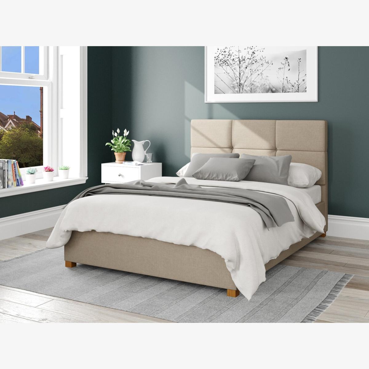 Stylish ottoman bed manufactured in the UK and hand upholstered in a beautiful, Eire Linen fabric. The Caine Fabric Ottoman Bed boasts a deep padded headboard with a sleek, modern design and stylish solid hardwood feet. It offers substantial storage, accessible through a gas lift mechanism that holds the bed open for hands-free use. The storage area includes a dust sheet but is not boarded. Quality spring slats enhance comfort and support, and while assembly of the flat-packed bed typically requires 1-2 hours and is more straightforward with two people. Additionally, the bed meets UK safety standards and has passed non-mandatory structural testing for added assurance.