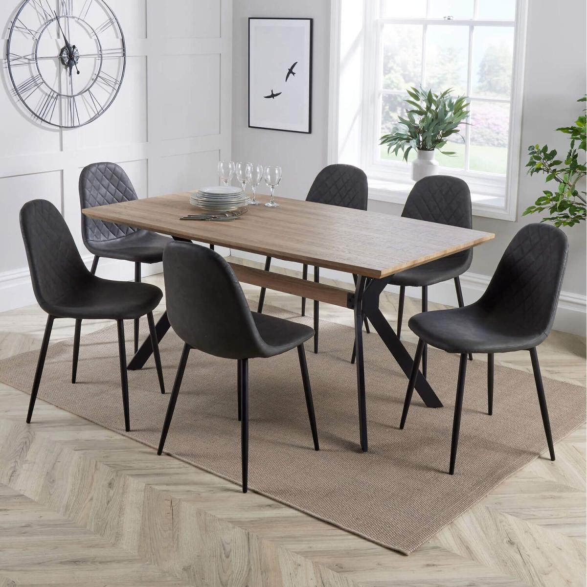 This Cairo Table is simple but attractive. Clean cut with a wooden surface, this table is ideal for any family dining setting. The surface is wipe-clean, adding to its practicality. Available as a full set with 6 Anastasia chairs, this table can seat 6 people comfortably. The Scandi style legs are sleek and straight, dark in colour. These Anastasia chairs look smart and stylish with the diamond patterned back and soft padded seat in grey PU fabric they will complement any modern home.