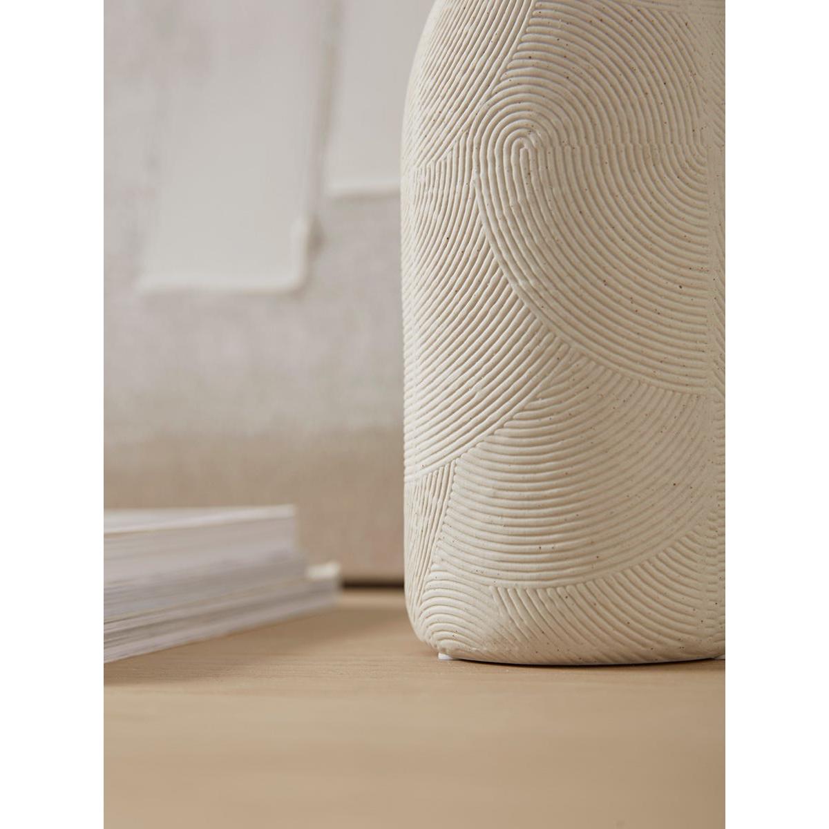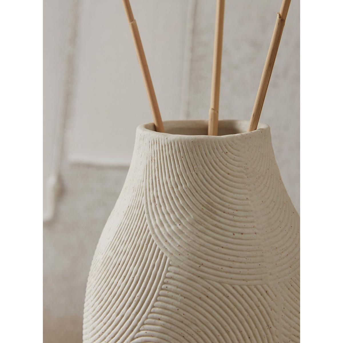 A swirling ribbed pattern adds movement and texture to enliven the matte finish of this cream vase.  The porcelain piece follows a simple cylindrical shape which softly narrows to an open mouth. The tall shape makes the perfect support for displaying tall stems and branches.