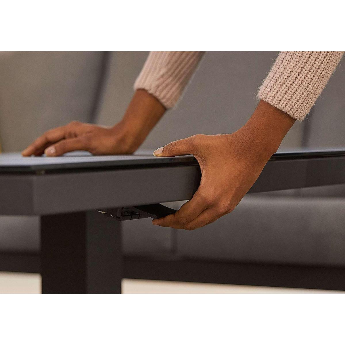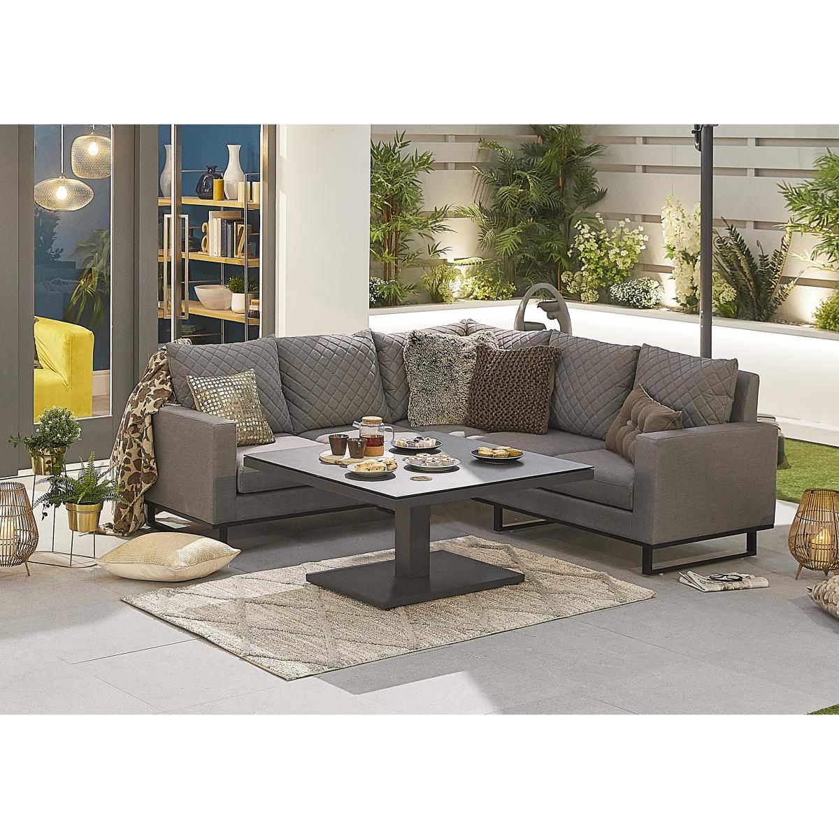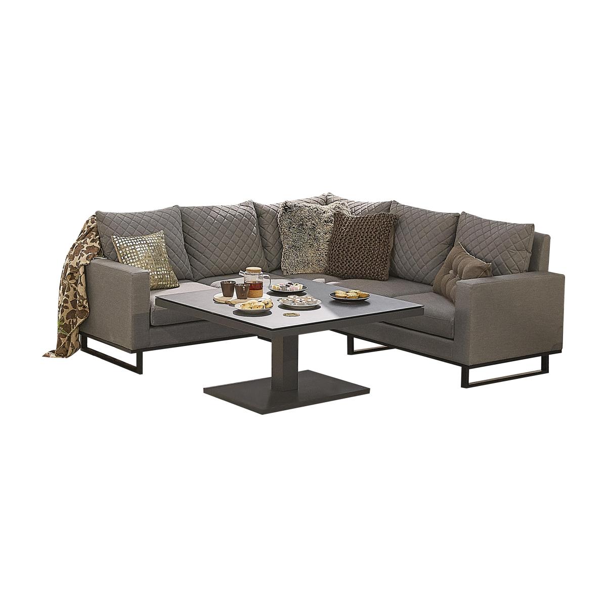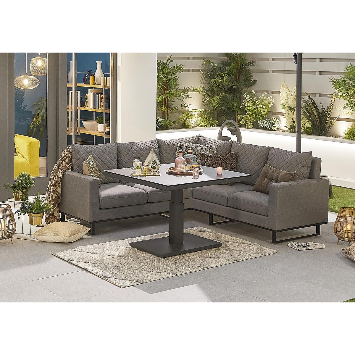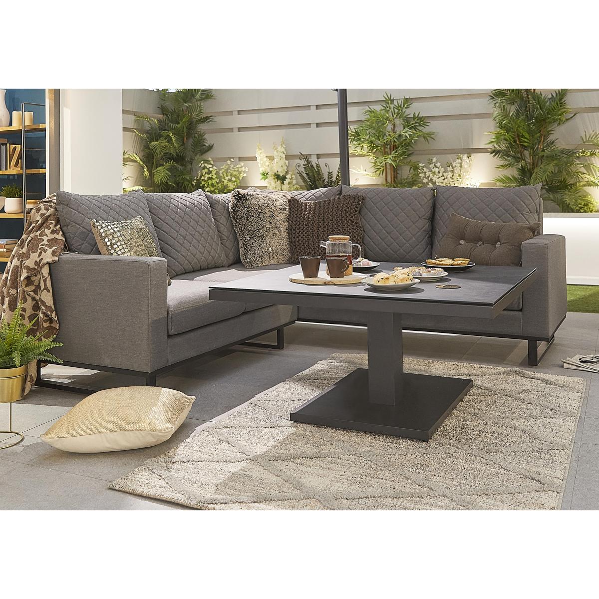Compact in scale, this corner garden sofa sits neatly in smaller outdoor spaces. And its cool urban vibe is a great fit too. We love the versatile table – raise it for a family lunch, lower it for evening drinks. Why you'll love it. Versatile corner sofa and table set for smaller outdoor spaces. Compact, contemporary and very comfortable. Choose classic back or scatter back corner sofa in grey. Upholstered in revolutionary easy-clean, water-repellent Sunbrella® fabric. Stain-, fade- and UV-resistant. Mould and mildew proof. Quick-dry foam cushion filling allows water to drain away. Sofa frame and legs in metal with a black finish. Square rising table is height-adjustable between 50 cm and 73 cm. A Furniture Village online exclusive. What you need to know. Sofa seats up to 5 adults. Sofa frame and rising table are made of aluminium. We recommend covering the sofa and table in wet weather and when not in use. Sunbrella fabric can be cleaned with plain or soapy water. Aluminium should be cleaned with warm soapy water and a soft cloth. Avoid abrasive cloths and chemical cleaners. If your aluminium furniture is exposed to coastal winds, wipe it regularly.